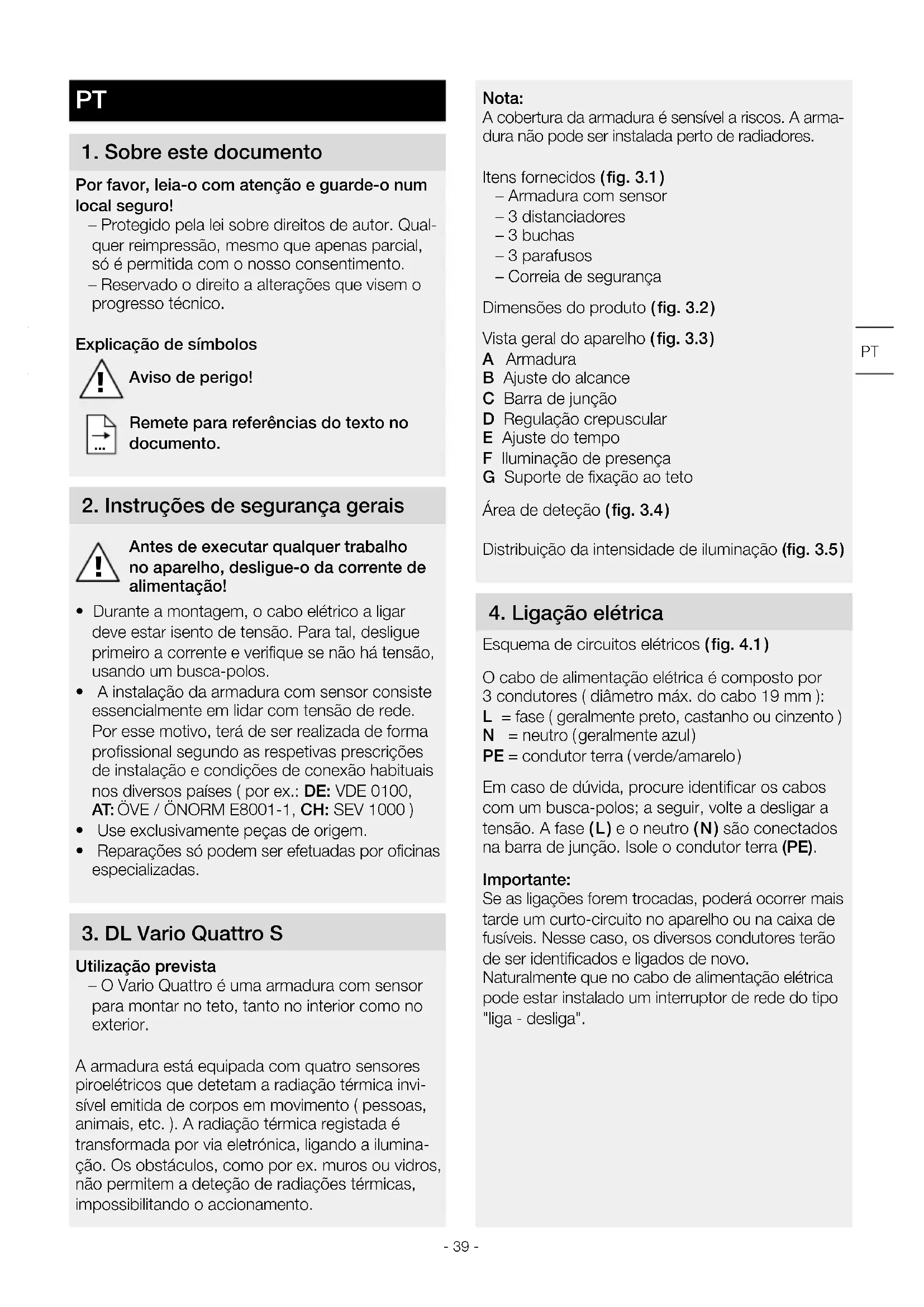 Utilização prevista – O Vario Quattro é uma armadura com sensor para montar no teto, tanto no interior como no exterior. A armadura está equipada com quatro sensores piroelétricos que detetam a radiação térmica invi- sível emitida de corpos em movimento ( pessoas, animais, etc. ). A radiação térmica registada é transformada por via eletrónica, ligando a ilumina- ção. Os obstáculos, como por ex. muros ou vidros, não permitem a deteção de radiações térmicas, impossibilitando o accionamento.