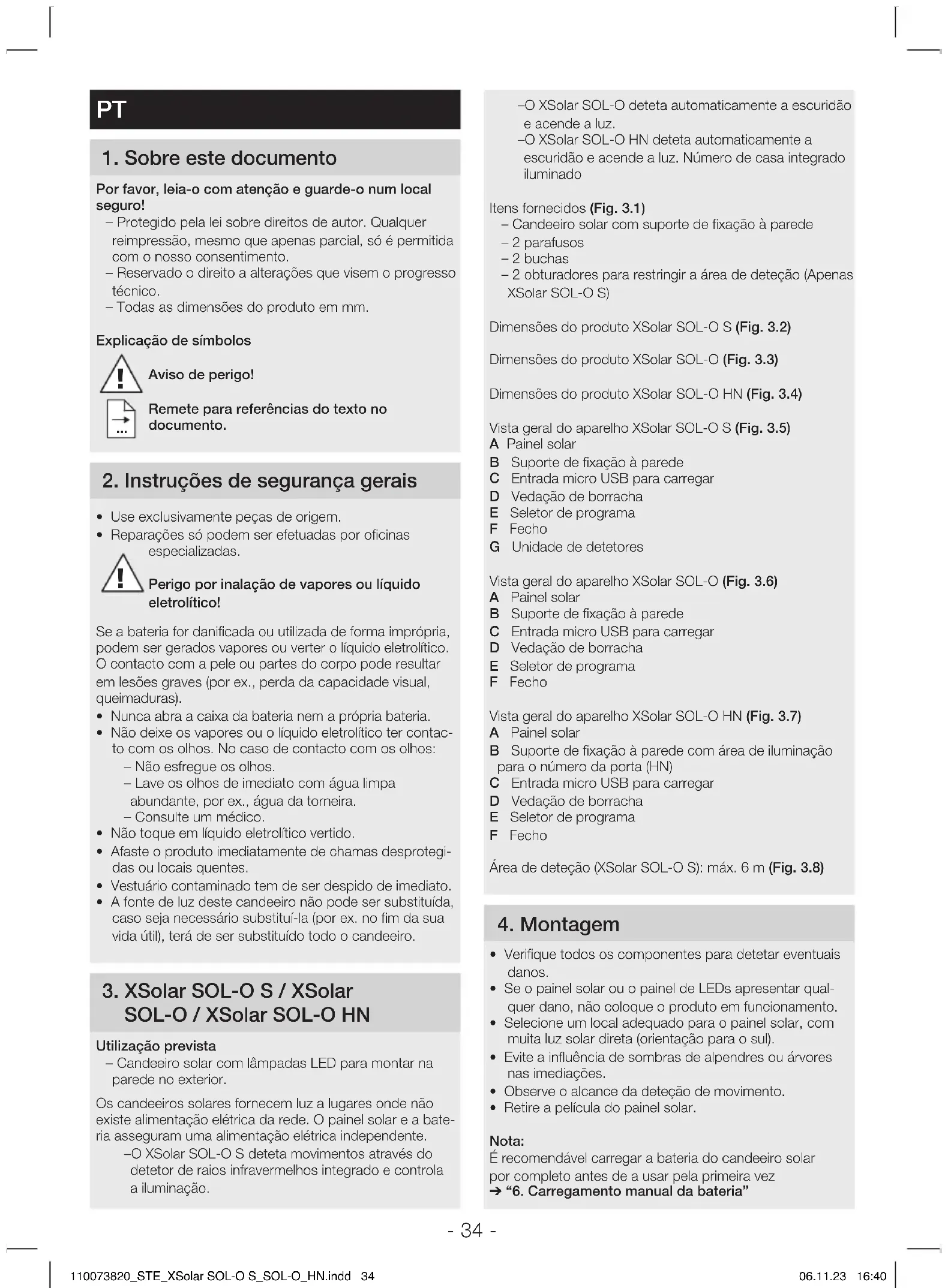 DO FABRICANTE GARANTIA ANOS DO FABRICANTE GARANTIA ANOS DO FABRICANTE 110073820_STE_XSolar SOL-O S_SOL-O_HN.indd 36110073820_STE_XSolar SOL-O S_SOL-O_HN.indd 36 06.11.23 16:4006.11.23 16:40- 37 - 11 Dados técnicos Dados técnicos do candeeiro solar XSolarSOL-OS XSolarSOL-O XSolarSOL-OHN Dimensões L×A×P (emmm) 242×53×91 242×38×91 242×183×91 Potência máx.3,3W máx.0,1W máx.0,1W Ângulo de deteção 360° - - Alcance de deteção máx. 6m - - Regulação crepuscular 2lux Ajuste do tempo 10 – 30s automaticamente - - Iluminação de presença 3% - - Fluxo luminoso máx.273lm máx.7,5lm máx.7,5lm Eficiência 83lm/W 75lm/W 75lm/W Temperatura de cor 3.000K Vida útil dos LEDs 50.000h Grau de proteção IP44 Classe de proteção III Intervalo de temperatura -20°C até +40°C Falha Causa Solução LED vermelho no detetor de movimento/na luz está intermitente ■ Capacidade da bateria insuficiente ■ Carregue a bateria com o carregador micro USB A luz não se acende ■ Capacidade da bateria insuficiente ■ Área de deteção ajustada incorretamente ■ Carregue a bateria com o carregador micro USB ■ Controle a área de deteção A luz não se apaga ■ Movimento constante na área de deteção ■ Controle a área de deteção A luz acende-se inadvertidamente ■ Movimento incontrolado dentro da área de deteção: o vento agita árvores e arbustos. São detetados automóveis a passar na estrada. Alteração térmica súbita devido a influências climatéricas (vento, chuva, neve) ou ar evacuado de ventiladores, janelas abertas. ■ O candeeiro oscila (mexe-se), por ex., devido a rajadas de vento ou chuva forte ■ Controle a área de deteção ■ Monte o candeeiro numa base firme Não é possível carregar a bateria ■ O painel solar está sujo ■ O local de montagem não é ideal para o painel solar ■ Limpe o painel solar com um pano macio e um detergente delicado ■ Verifique o local de montagem (máximo de luz solar direta possível) Perigo de danos materiais durante períodos de não utilização ■ Se o candeeiro não for usado durante um período mais longo (por ex., porque foi guardado em algum lugar), é possível que a bateria descarregue totalmente sem reversão possível ■ Coloque o seletor de programas em P0 ou OFF ■ Antes do período de não utilização, carregue a bateria completamente ■ Durante o período de não utilização, recarregue a bateria regularmente 10 Falhas de funcionamento Dados técnicos da bateria XSolarSOL-OS XSolarSOL-O XSolarSOL-OHN Tipo Lítioferroso(LiFePO4) Capacidade 2×2.000mAH 2.000mAH 2.000mAH Vida útil máx. 20dias, assumindo 20ativações por noite Entrada micro USB para carregar 5V,máx.1A