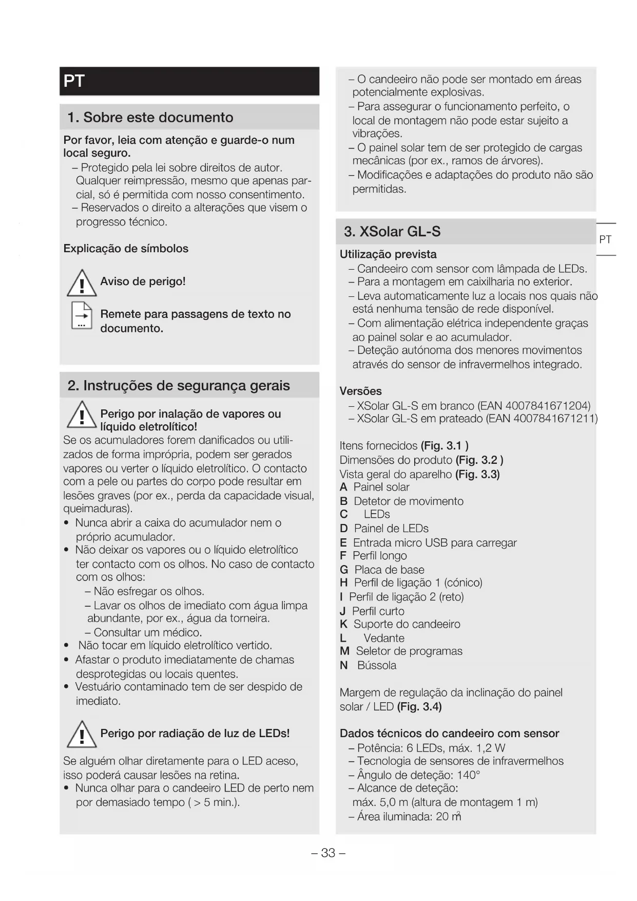 Utilização prevista – Candeeiro com sensor com lâmpada de LEDs. – Para a montagem em caixilharia no exterior. – Leva automaticamente luz a locais nos quais não está nenhuma tensão de rede disponível. – Com alimentação elétrica independente graças ao painel solar e ao acumulador. – Deteção autónoma dos menores movimentos através do sensor de infravermelhos integrado. Versões – XSolar GL-S em branco (EAN4007841671204) – XSolar GL-S em prateado (EAN4007841671211) Itens fornecidos (Fig. 3.1 ) Dimensões do produto (Fig. 3.2 ) Vista geral do aparelho (Fig. 3.3) A Painel solar B Detetor de movimento C LEDs D Painel de LEDs E Entrada micro USB para carregar F Perfil longo G Placa de base H Perfil de ligação 1 (cónico) I Perfil de ligação 2 (reto) J Perfil curto K Suporte do candeeiro L Vedante M Seletor de programas N Bússola Margem de regulação da inclinação do painel solar/LED (Fig. 3.4) Dados técnicos do candeeiro com sensor – Potência: 6 LEDs, máx. 1,2 W – Tecnologia de sensores de infravermelhos – Ângulo de deteção: 140° – Alcance de deteção: máx. 5,0 m (altura de montagem 1 m) – Área iluminada: 20 m