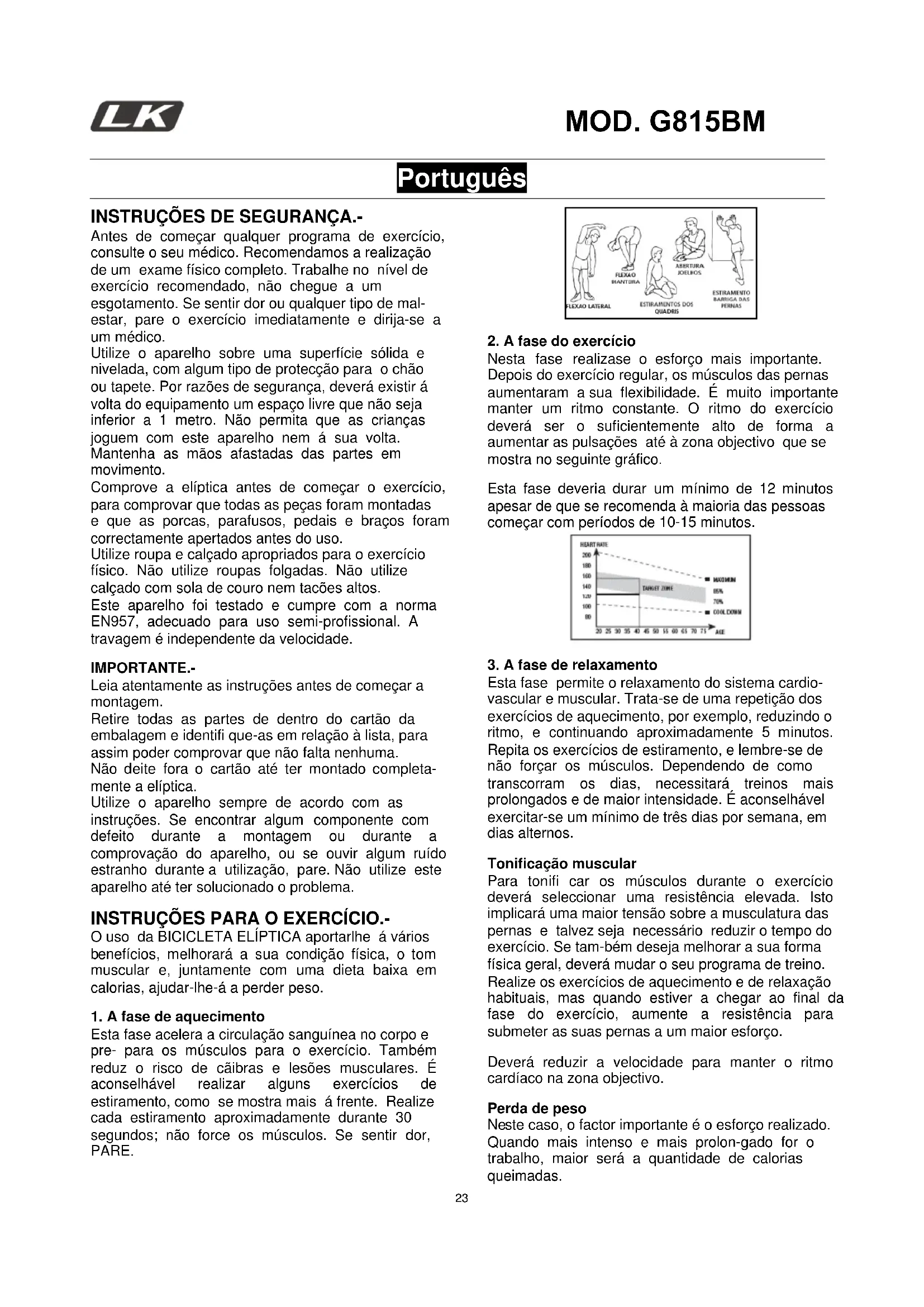 Antes de começar qualquer programa de exercício, consulte o seu médico. Recomendamos a realização de um exame físico completo. Trabalhe no nível de exercício recomendado, não chegue a um esgotamento. Se sentir dor ou qualquer tipo de mal- estar, pare o exercício imediatamente e dirija-se a um médico. Utilize o aparelho sobre uma superfície sólida e nivelada, com algum tipo de protecção para o chão ou tapete. Por razões de segurança, deverá existir á volta do equipamento um espaço livre que não seja inferior a 1 metro. Não permita que as crianças joguem com este aparelho nem á sua volta. Mantenha as mãos afastadas das partes em movimento. Comprove a elíptica antes de começar o exercício, para comprovar que todas as peças foram montadas e que as porcas, parafusos, pedais e braços foram correctamente apertados antes do uso. Utilize roupa e calçado apropriados para o exercício físico. Não utilize roupas folgadas. Não utilize calçado com sola de couro nem tacões altos. Este aparelho foi testado e cumpre com a norma EN957, adecuado para uso semi-profissional. A travagem é independente da velocidade. IMPORTANTE.-