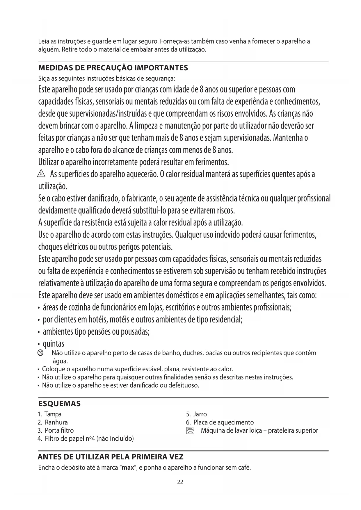 Siga as seguintes instruções básicas de segurança: Este aparelho pode ser usado por crianças com idade de 8 anos ou superior e pessoas com capacidades físicas, sensoriais ou mentais reduzidas ou com falta de experiência e conhecimentos, desde que supervisionadas/instruídas e que compreendam os riscos envolvidos. As crianças não devem brincar com o aparelho. A limpeza e manutenção por parte do utilizador não deverão ser feitas por crianças a não ser que tenham mais de 8 anos e sejam supervisionadas. Mantenha o aparelho e o cabo fora do alcance de crianças com menos de 8 anos. Utilizar o aparelho incorretamente poderá resultar em ferimentos. h As superfícies do aparelho aquecerão. O calor residual manterá as superfícies quentes após a utilização. Se o cabo estiver danicado, o fabricante, o seu agente de assistência técnica ou qualquer prossional devidamente qualicado deverá substituí-lo para se evitarem riscos. A superfície da resistência está sujeita a calor residual após a utilização. Use o aparelho de acordo com estas instruções. Qualquer uso indevido poderá causar ferimentos, choques elétricos ou outros perigos potenciais. Este aparelho pode ser usado por pessoas com capacidades físicas, sensoriais ou mentais reduzidas ou falta de experiência e conhecimentos se estiverem sob supervisão ou tenham recebido instruções relativamente à utilização do aparelho de uma forma segura e compreendam os perigos envolvidos. Este aparelho deve ser usado em ambientes domésticos e em aplicações semelhantes, tais como: