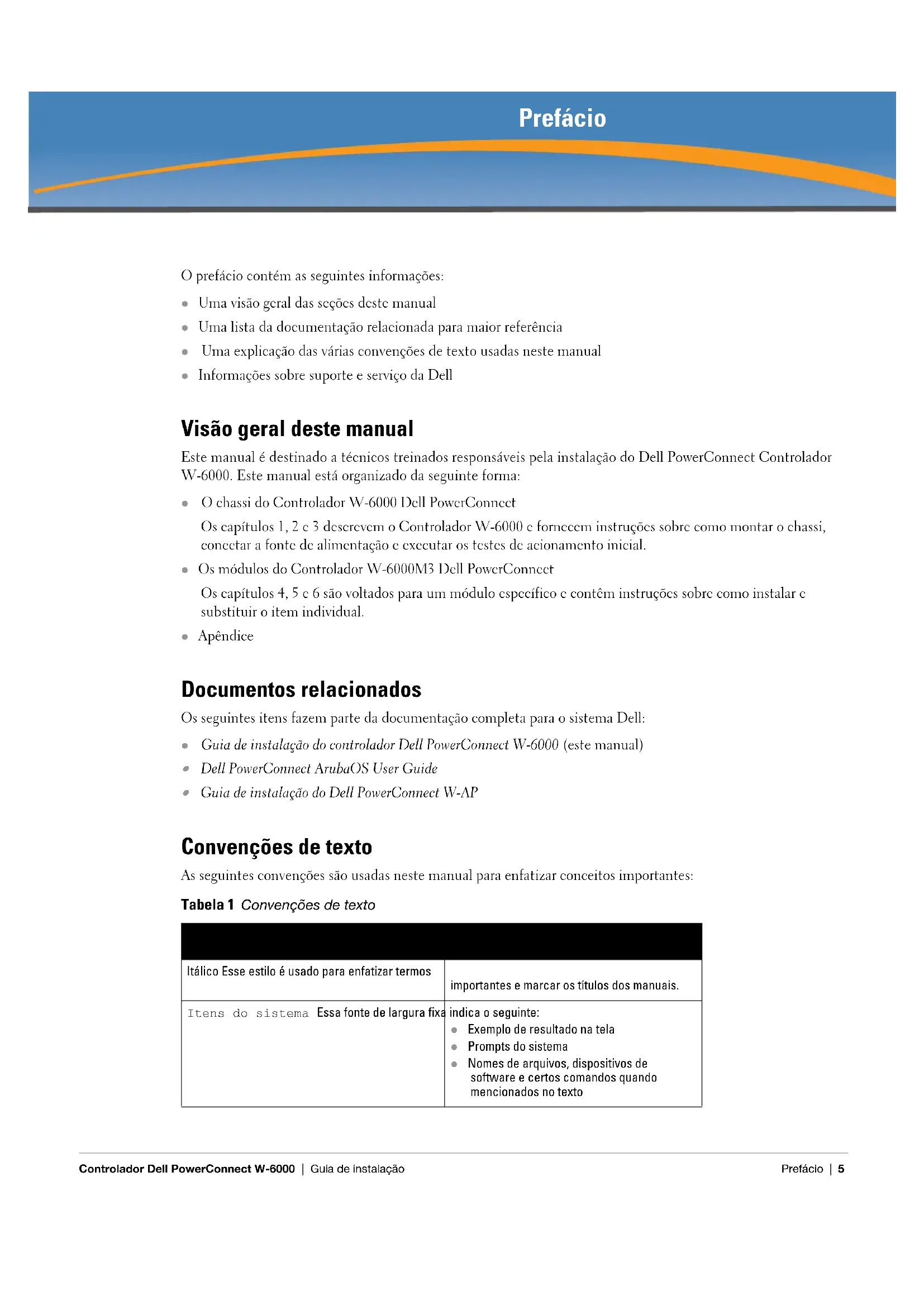 Guia de instalação do Dell PowerConnect W-AP Convenções de texto As seguintes convenções são usadas neste manual para enfatizar conceitos importantes: Tabela 1 Convenções de texto Itálico Esse estilo é usado para enfatizar termos importantes e marcar os títulos dos manuais.Itens do sistema Essa fonte de largura fixa indica o seguinte:z Exemplo de resultado na telaz Prompts do sistemaz Nomes de arquivos, dispositivos de software e certos comandos quando mencionados no texto6 | Prefácio Controlador Dell PowerConnect W-6000 | Guia de instalação Como entrar em contato com o suporte Comandos Nos exemplos de comando, essa fonte em negrito indica texto que o usuário deve digitar exatamente como mostrado. <Argumentos> Nos exemplos de comando, o texto em itálico entre os colchetes angulares representa itens que o usuário deve substituir por informações apropriadas à situação específica. Por exemplo: # send <mensagem de texto> Neste exemplo, o usuário digitaria “send” no prompt do sistema exatamente como mostrado, seguido pela mensagem de texto que deseja enviar. Não digite os colchetes angulares. [Opcional] Nos exemplos de comando, os itens entre colchetes são opcionais. Não digite os colchetes. {Item A | Item B} Nos exemplos de comando, os itens entre chaves e separados por uma barra vertical representam as opções disponíveis. Digite apenas uma opção. Não use as chaves nem as barras. Tabela 2 Informações de contato da Dell Site Site principal dell.com Site do suporte support.dell.com Site de documentação support.dell.com/manuals Tabela 1 Convenções de textoControlador Dell PowerConnect W-6000 | Guia de instalação Visão geral do sistema | 7 Capítulo 1 Visão geral do sistema O Dell PowerConnect Controlador W-6000 é um chassi modular de classe corporativa que conecta, controla e integra de forma inteligente pontos de acesso (APs) sem fio e monitores de ar (AMs) à rede LAN cabeada. Este capítulo apresenta o Controlador W-6000. Ele descreve os recursos gerais do sistema modular e ilustra os principais elementos físicos. Depois de se familiarizar com o sistema, você pode iniciar o processo de instalação detalhado no próximo capítulo. Recursos Esta seção descreve os recursos gerais do Controlador W-6000. z Switch 10/100/1000 Mbps e 10 Gbps com encaminhamento de pacote em alta velocidade pelas camadas 2/3. z O processamento de pacotes de alto desempenho agrega valor a serviços sem fio, como balanceamento de carga, limitação de velocidade, correção automática, calibração, autenticação, mobilidade, segurança, monitoramento centralizado e configuração. z O chassi 3U pode ser montado em um rack de telecomunicação ou de servidor padrão de 19 polegadas. z O chassi modular baseado em slot permite a expansão da rede e a tolerância a falhas. Até 4 módulos Dell PowerConnect W-6000M3 Até 3 fontes de alimentação que podem ser trocadas a quente com capacidade para compartilhamento de carga para proporcionar redundância Uma bandeja do ventilador contendo três ventiladores individuais para proporcionar redundância Descrição física Figura 1 Controlador W-6000 Dell PowerConnect Slot 0: esse slot é para o módulo Controlador W-6000M3 Dell PowerConnect necessário. Slot 1: esse slot é para um módulo W-6000M3 adicional.