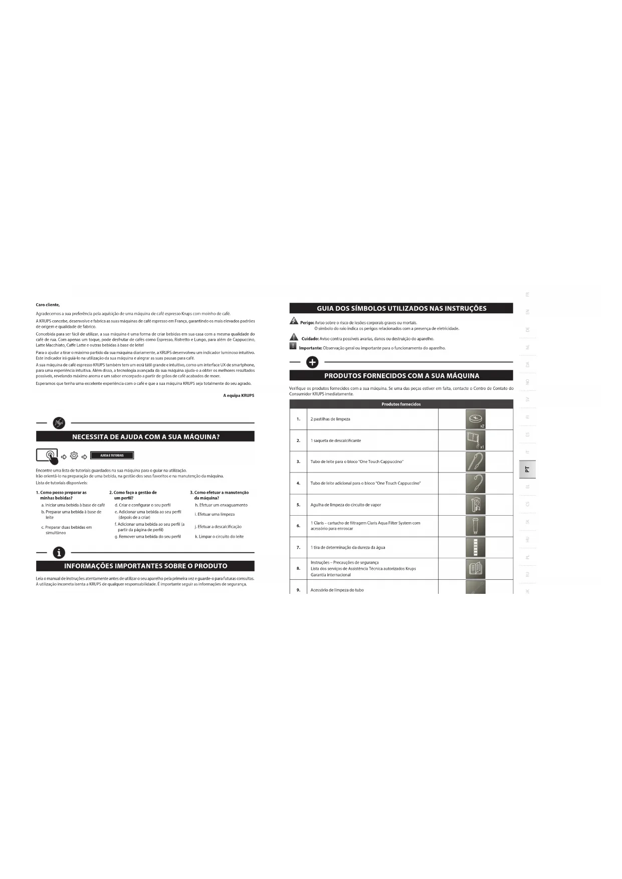 Caro cliente,Agradecemos a sua preferência pela aquisição de uma máquina de café espresso Krups com moinho de café.A KRUPS concebe, desenvolve e fabrica as suas máquinas de café espresso em França, garantindo os mais elevados padrões de origem e qualidade de fabrico. Concebida para ser fácil de utilizar, a sua máquina é uma forma de criar bebidas em sua casa com a mesma qualidade do café de rua. Com apenas um toque, pode desfrutar de cafés como Espresso, Ristretto e Lungo, para além de Cappuccino, Latte Macchiato, Cae Latte e outras bebidas à base de leite!Para o ajudar a tirar o máximo partido da sua máquina diariamente, a KRUPS desenvolveu um indicador luminoso intuitivo. Este indicador irá guiá-lo na utilização da sua máquina e alegrar as suas pausas para café.A sua máquina de café espresso KRUPS também tem um ecrã tátil grande e intuitivo, como um interface UX de smartphone, para uma experiência intuitiva. Além disso, a tecnologia avançada da sua máquina ajuda-o a obter os melhores resultados possíveis, revelando máximo aroma e um sabor encorpado a partir de grãos de café acabados de moer.Esperamos que tenha uma excelente experiência com o café e que a sua máquina KRUPS seja totalmente do seu agrado.A equipa KRUPS NECESSITA DE AJUDA COM A SUA MÁQUINA? AJUDA E TUTORIAISEncontre uma lista de tutoriais guardados na sua máquina para o guiar na utilização.Irão orientá-lo na preparação de uma bebida, na gestão dos seus favoritos e na manutenção da máquina.Lista de tutoriais disponíveis:1. Como posso preparar as minhas bebidas?2. Como faço a gestão de um perl?3. Como efetuar a manutenção da máquina? a. Iniciar uma bebida à base de café d. Criar e congurar o seu perl h. Efetuar um enxaguamento b. Preparar uma bebida à base de leitee. Adicionar uma bebida ao seu perl (depois de a criar)i. Efetuar uma limpezac. Preparar duas bebidas em simultâneof. Adicionar uma bebida ao seu perl (a partir da página de perl)j. Efetuar a descalcicaçãog. Remover uma bebida do seu perl k. Limpar o circuito do leite
