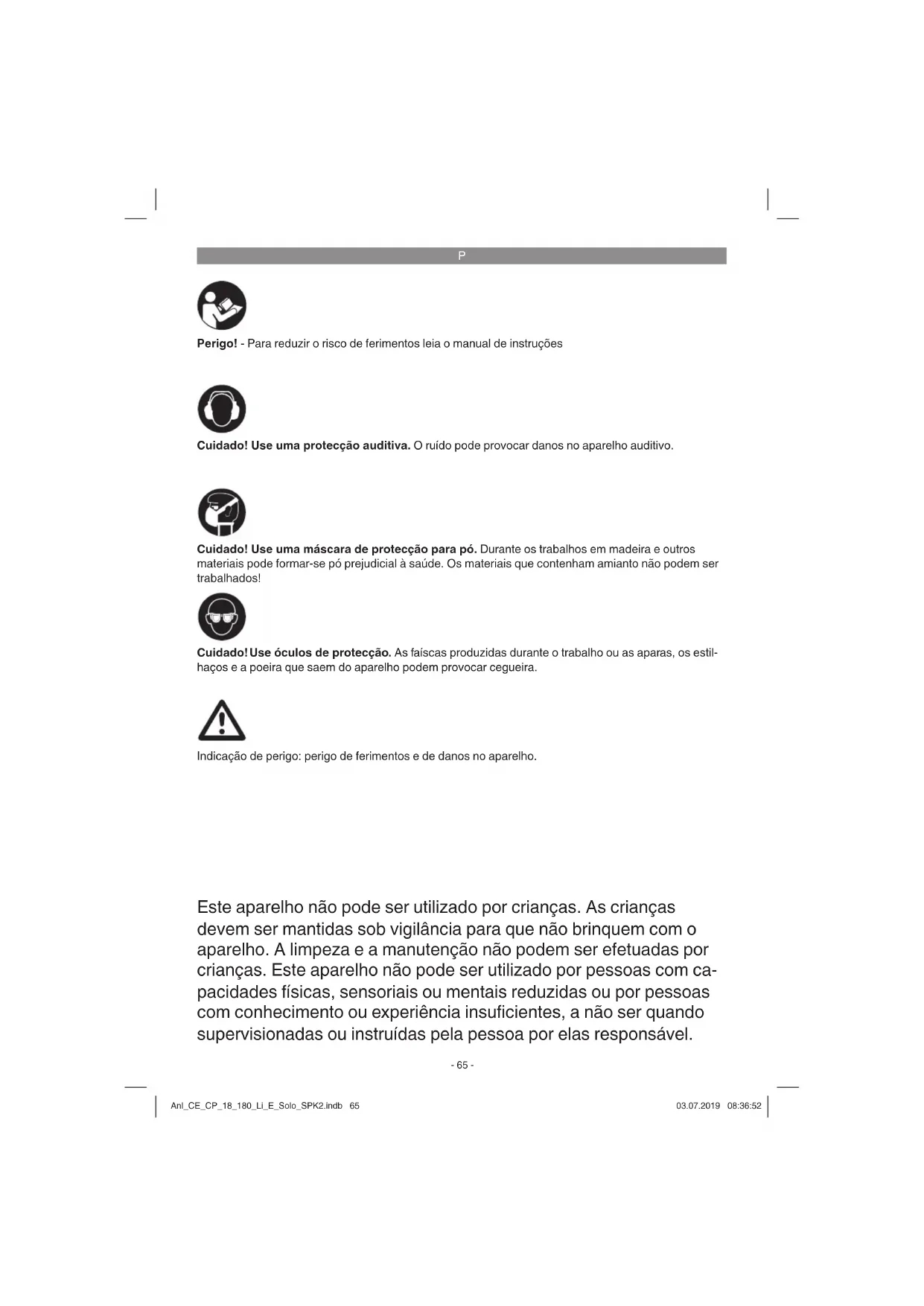 Perigo! - Para reduzir o risco de ferimentos leia o manual de instruções Cuidado! Use uma protecção auditiva. O ruído pode provocar danos no aparelho auditivo. Cuidado! Use óculos de protecção. As faíscas produzidas durante o trabalho ou as aparas, os estil- haços e a poeira que saem do aparelho podem provocar cegueira. Cuidado! Use uma máscara de protecção para pó. Durante os trabalhos em madeira e outros materiais pode formar-se pó prejudicial à saúde. Os materiais que contenham amianto não podem ser trabalhados! Indicação de perigo: perigo de ferimentos e de danos no aparelho. Este aparelho não pode ser utilizado por crianças. As crianças devem ser mantidas sob vigilância para que não brinquem com o aparelho. A limpeza e a manutenção não podem ser efetuadas por crianças. Este aparelho não pode ser utilizado por pessoas com ca- pacidades físicas, sensoriais ou mentais reduzidas ou por pessoas com conhecimento ou experiência insufi cientes, a não ser quando supervisionadas ou instruídas pela pessoa por elas responsável. Anl_CE_CP_18_180_Li_E_Solo_SPK2.indb 65Anl_CE_CP_18_180_Li_E_Solo_SPK2.indb 65 03.07.2019 08:36:5203.07.2019 08:36:52P