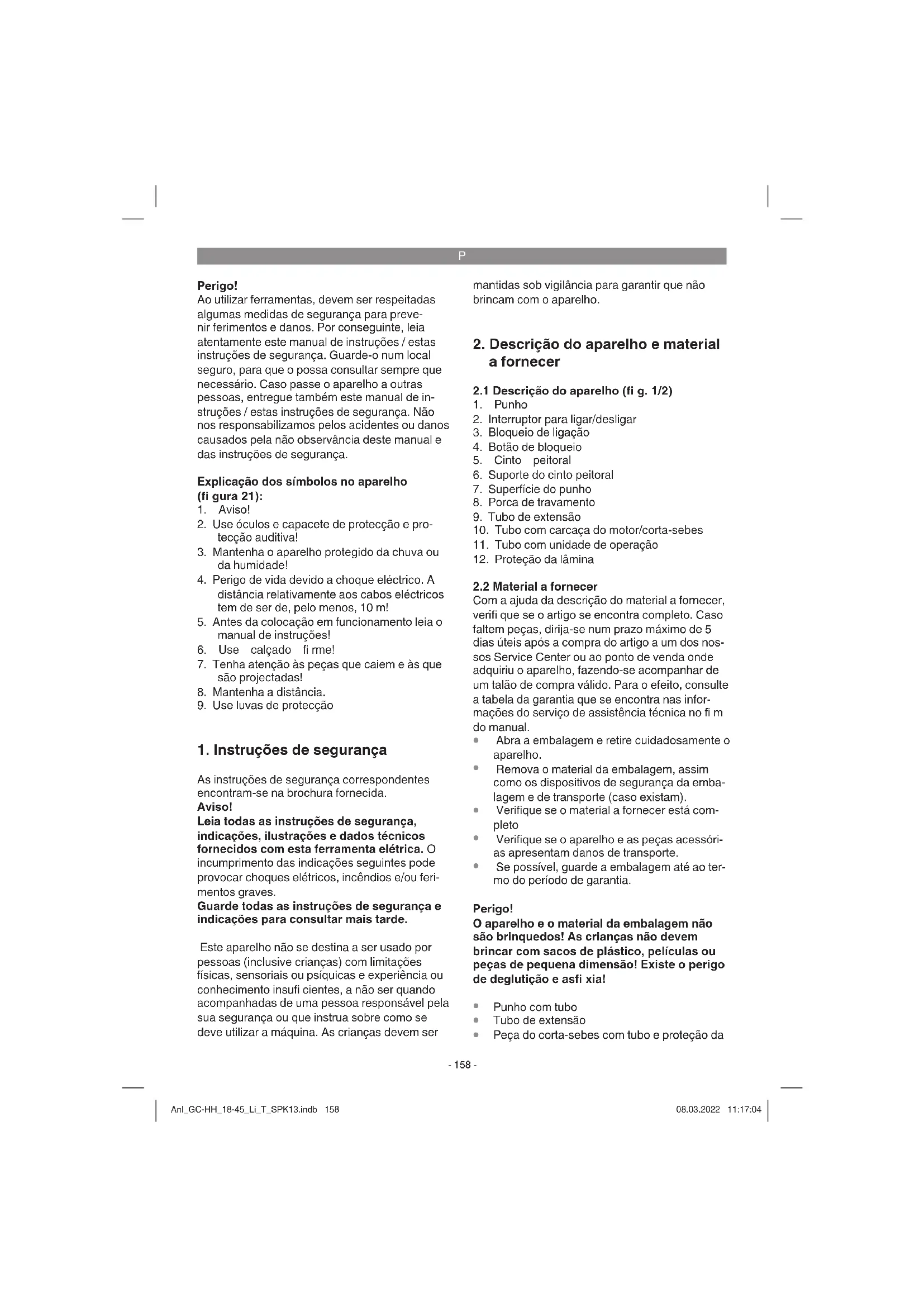 e o pack de acumuladores para o nosso serviço de assistência técnica. Para o envio correto, contacte o nosso ser- viço de assistência técnica ou o ponto de venda onde adquiriu o aparelho. Ao enviar ou eliminar baterias ou o aparelho sem fi o, certifi que-se de que estes são emba- lados individualmente em sacos de plástico para evitar curto-circuitos e incêndios! Tendo em vista uma longa vida útil do pack de baterias, deve providenciar o seu recarregamento atempado. Isto é absolutamente necessário se verifi car que a capacidade do aparelho está a diminuir. Nunca deixe o pack de baterias descar- regar-se completamente. Esta situação poderia provocar uma avaria no pack de baterias! Anl_GC-HH_18-45_Li_T_SPK13.indb 160Anl_GC-HH_18-45_Li_T_SPK13.indb 160 08.03.2022 11:17:0408.03.2022 11:17:04P