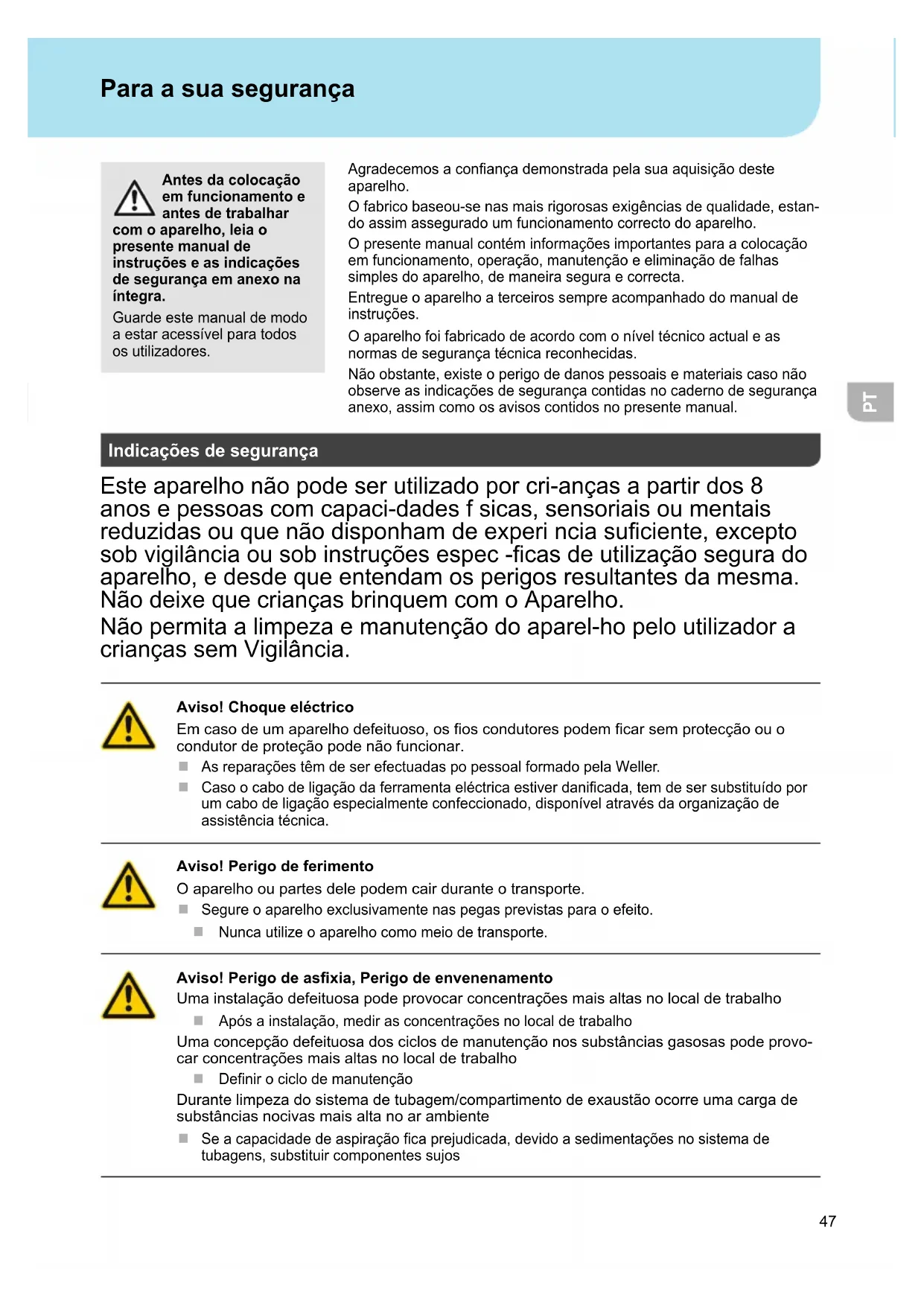 gradecemosaconançademonstradapelasuaauisiçodeste aparelho. O fabrico baseou-se nas mais rigorosas exigências de qualidade, estan- do assim assegurado um funcionamento correcto do aparelho. O presente manual contém informações importantes para a colocação em funcionamento, operação, manutenção e eliminação de falhas simples do aparelho, de maneira segura e correcta. Entregue o aparelho a terceiros sempre acompanhado do manual de instruções. Oaparelhofoifaricadodeacordocomoníveltécnicoactualeas normas de segurança técnica reconhecidas. Não obstante, existe o perigo de danos pessoais e materiais caso não observe as indicações de segurança contidas no caderno de segurança anexo, assim como os avisos contidos no presente manual. Para a sua segurança Antes da colocação em funcionamento e antes de trabalhar com o aparelho, leia o presente manual de instruções e as indicações de segurança em anexo na íntegra. uardeestemanualdemodo aestaracessívelparatodos os utilizadores. Indicações de segurança Este aparelho não pode ser utilizado por cri-anças a partir dos 8 anos e pessoas com capaci-dades f sicas, sensoriais ou mentais reduzidasouuenodisponhamdeeperinciasucienteecepto sovigilnciaousoinstruçesespeccasdeutilizaçosegurado aparelho, e desde que entendam os perigos resultantes da mesma. Não deixe que crianças brinquem com o Aparelho. Não permita a limpeza e manutenção do aparel-ho pelo utilizador a crianças sem Vigilância. Aviso! Choque eléctrico Emcasodeumaparelhodefeituosoososcondutorespodemcarsemprotecçoouo condutor de proteção pode não funcionar. sreparaçestmdeserefectuadaspopessoalformadopelaeller asoocaodeligaçodaferramentaeléctricaestiverdanicadatemdesersustituídopor umcaodeligaçoespecialmenteconfeccionadodisponívelatravésdaorganizaçode assistência técnica. Aviso! Perigo de ferimento O aparelho ou partes dele podem cair durante o transporte. Segure o aparelho exclusivamente nas pegas previstas para o efeito. Nunca utilize o aparelho como meio de transporte. Aviso! Perigo de asxia, Perigo de envenenamento Uma instalação defeituosa pode provocar concentrações mais altas no local de trabalho Após a instalação, medir as concentrações no local de trabalho Uma concepção defeituosa dos ciclos de manutenção nos substâncias gasosas pode provo- car concentrações mais altas no local de trabalho enirociclodemanutenço Durante limpeza do sistema de tubagem/compartimento de exaustão ocorre uma carga de substâncias nocivas mais alta no ar ambiente eacapacidadedeaspiraçocaprejudicadadevidoasedimentaçesnosistemade tubagens, substituir componentes sujos48