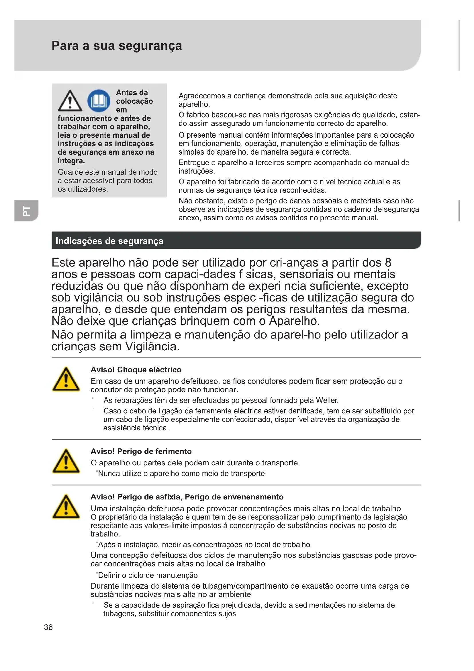 funcionamento e antes de trabalhar com o aparelho, leia o presente manual de instruções e as indicações de segurança em anexo na íntegra. Guarde este manual de modo aestaracessívelparatodos os utilizadores. Agradecemosaconançademonstradapelasuaaquisiçãodeste aparelho. Ofabricobaseou-senasmaisrigorosasexigênciasdequalidade,estan- do assim assegurado um funcionamento correcto do aparelho. O presente manual contém informações importantes para a colocação emfuncionamento,operação,manutençãoeeliminaçãodefalhas simplesdoaparelho,demaneiraseguraecorrecta. Entregue o aparelho a terceiros sempre acompanhado do manual de instruções. Oaparelhofoifabricadodeacordocomoníveltécnicoactualeas normas de segurança técnica reconhecidas. Nãoobstante,existeoperigodedanospessoaisemateriaiscasonão observe as indicações de segurança contidas no caderno de segurança anexo,assimcomoosavisoscontidosnopresentemanual. Indicações de segurança Este aparelho não pode ser utilizado por cri-anças a partir dos 8 anosepessoascomcapaci-dadesfsicas,sensoriaisoumentais reduzidasouquenãodisponhamdeexperinciasuciente,excepto sobvigilânciaousobinstruçõesespec-casdeutilizaçãosegurado aparelho,edesdequeentendamosperigosresultantesdamesma. NãodeixequecriançasbrinquemcomoAparelho. Não permita a limpeza e manutenção do aparel-ho pelo utilizador a criançassemVigilância. Aviso! Choque eléctrico Emcasodeumaparelhodefeituoso,ososcondutorespodemcarsemprotecçãoouo condutor de proteção pode não funcionar. ˚ As reparações têm de ser efectuadas po pessoal formado pela Weller. ˚ Casoocabodeligaçãodaferramentaeléctricaestiverdanicada,temdesersubstituídopor umcabodeligaçãoespecialmenteconfeccionado,disponívelatravésdaorganizaçãode assistência técnica. Aviso! Perigo de ferimento O aparelho ou partes dele podem cair durante o transporte. ˚ Nunca utilize o aparelho como meio de transporte. Aviso! Perigo de asxia, Perigo de envenenamento Umainstalaçãodefeituosapodeprovocarconcentraçõesmaisaltasnolocaldetrabalho Oproprietáriodainstalaçãoéquemtemdeseresponsabilizarpelocumprimentodalegislação respeitanteaosvalores-limiteimpostosàconcentraçãodesubstânciasnocivasnopostode trabalho. ˚ Apósainstalação,medirasconcentraçõesnolocaldetrabalho Umaconcepçãodefeituosadosciclosdemanutençãonossubstânciasgasosaspodeprovo- car concentrações mais altas no local de trabalho ˚ Denirociclodemanutenção Durantelimpezadosistemadetubagem/compartimentodeexaustãoocorreumacargade substânciasnocivasmaisaltanoarambiente ˚ Seacapacidadedeaspiraçãocaprejudicada,devidoasedimentaçõesnosistemade tubagens,substituircomponentessujos37