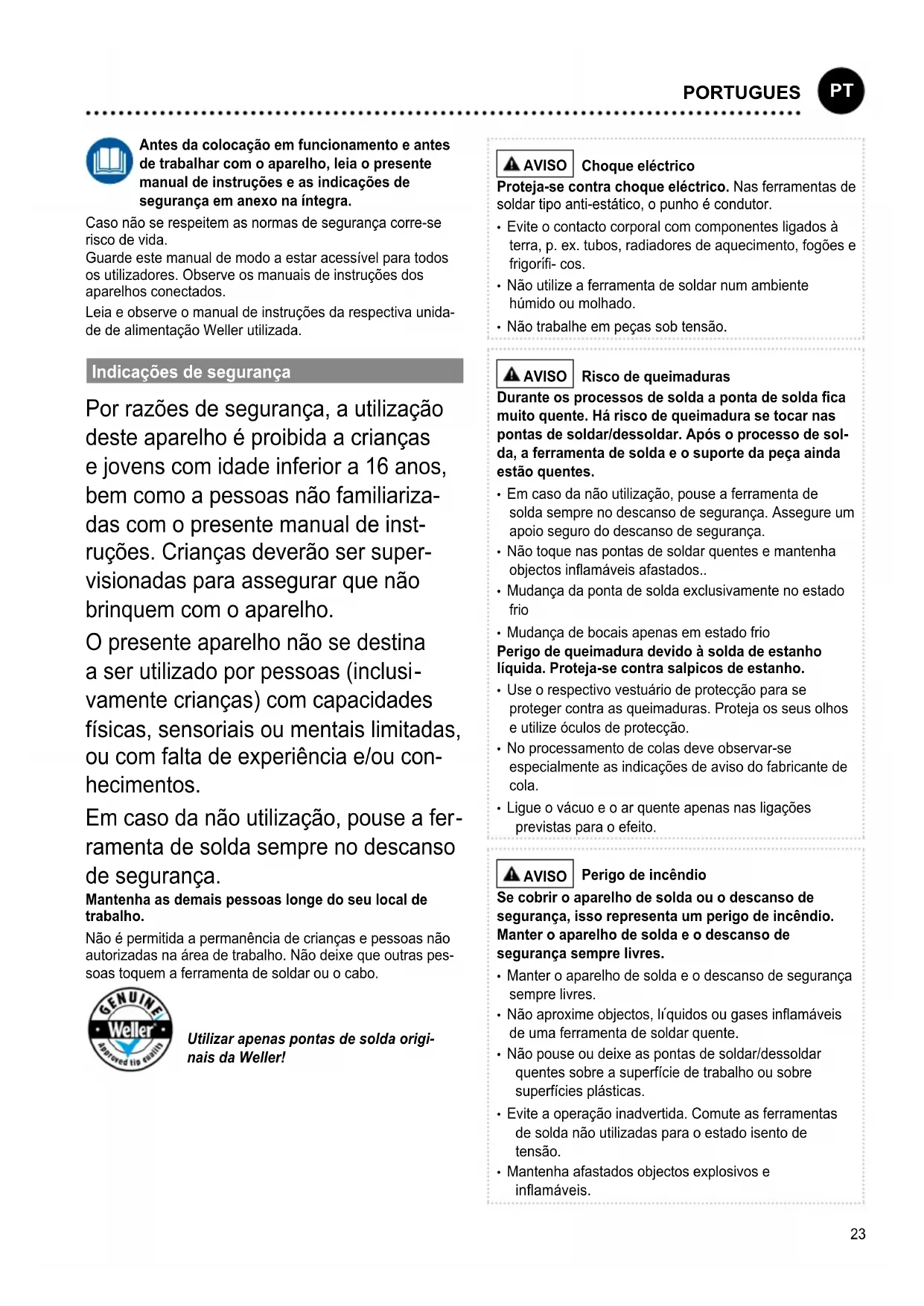 ITALIANO23 Antes da colocação em funcionamento e antes de trabalhar com o aparelho, leia o presente manual de instruções e as indicações de segurança em anexo na íntegra. Caso não se respeitem as normas de segurança corre-se risco de vida. Guarde este manual de modo a estar acessível para todos os utilizadores. Observe os manuais de instruções dos aparelhos conectados. Leia e observe o manual de instruções da respectiva unida- de de alimentação Weller utilizada. Indicações de segurança Por razões de segurança, a utilização deste aparelho é proibida a crianças e jovens com idade inferior a 16 anos, bem como a pessoas não familiariza