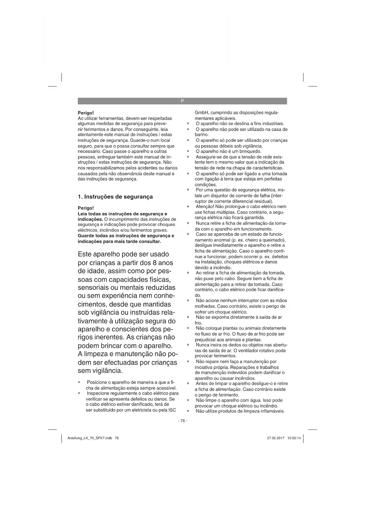Perigo! Ao utilizar ferramentas, devem ser respeitadas algumas medidas de segurança para preve- nir ferimentos e danos. Por conseguinte, leia atentamente este manual de instruções / estas instruções de segurança. Guarde-o num local seguro, para que o possa consultar sempre que necessário. Caso passe o aparelho a outras pessoas, entregue também este manual de in- struções / estas instruções de segurança. Não nos responsabilizamos pelos acidentes ou danos causados pela não observância deste manual e das instruções de segurança.