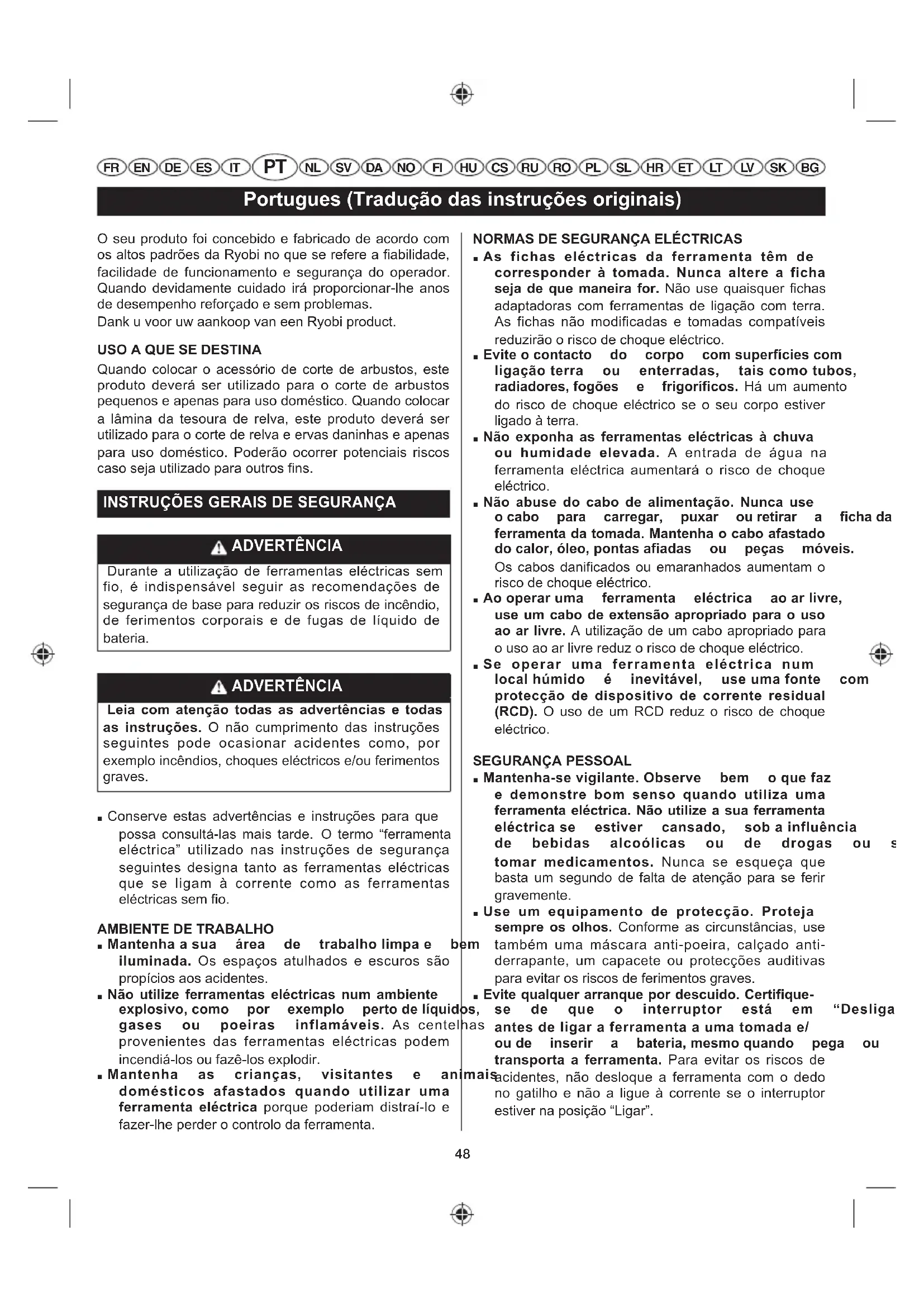 FR EN DE ES IT NL SV DA NO FI HU CS RU RO PL SL HR ET LT LV SK BG trabalho bem iluminado (luz do dia ou luz artificial). ■ Conserve sempre o seu equilíbrio e não utilize esta ferramenta num suporte instável. Fique sempre bem apoiado nas pernas e não estique demasiado o braço. Não utilize esta ferramenta numa escada. ■ Não force a ferramenta. A sua ferramenta será mais eficaz e mais segura se a utilizar no regime para o qual foi concebida. ■ Solte o gatilho, espere que o motor pare completamente e em seguida retire a bateria antes de limpar a sua ferramenta, repará-la ou efectuar ajustes. ■ Utilize a tesoura de relva para cortar relva ou plantas finas unicamente. Utilize o aparador de sebes unicamente para podar sebes, moitas ou arbustos. Não utilize esta ferramenta para outras aplicações. ■ Antes de pôr a ferramenta a trabalhar, certifique-se de que a lâmina não encontrará obstáculos. Se a tesoura de relva / aparador de sebes bater contra um obstáculo ou se certos elementos bloquearem a lâmina, pare imediatamente a ferramenta, retire a bateria e verifique se nenhuma peça está danificada. Não utilize a ferramenta antes de ter feito as reparações requeridas. Não utilize a ferramenta se certas peças não estiverem correctamente fixadas ou se estiverem danificadas. ■ Observe bem o que está a fazer. Use o seu bom senso. ■ Trate as ferramentas com cuidado. Verifique se lâmina está limpa e bem afiada para que a ferramenta seja eficaz e possa ser utilizada com toda a segurança. Lubrifique e mude os acessórios segundo as instruções. Conserve as pegas sempre secas e limpas, sem marcas de óleo nem de massa. ■ Verifique se nenhuma peça está danificada. Antes de continuar a utilizar a sua ferramenta, verifique se uma peça ou um acessório danificado poderá continuar a funcionar ou a desempenhar a sua função. Verifique o alinhamento das peças móveis. Verifique se nenhuma peça está partida. Controle a montagem e qualquer outro elemento que possa afectar o funcionamento da ferramenta. Um protector de lâmina ou qualquer outra peça danificada deve ser reparado ou substituído por um Centro de Serviço Autorizado, salvo indicação contrária neste manual de utilização. ■ Para evitar os riscos de ferimentos, mantenha as mãos afastadas da lâmina. Não tente retirar o elemento cortado nem segurar o elemento a cortar quando a lâmina estiver em movimento. Certifique- se de que a bateria foi retirada e que o gatilho está solto antes de retirar um elemento bloqueado na lâmina. Tenha o cuidado de não agarrar a ferramenta segurando-a pela lâmina. AVISO A lâmina continua a funcionar por inércia durante alguns momentos depois da paragem da ferramenta. ■ Conserve as mãos, o rosto e os pés afastados das peças móveis. Não tente tocar nem parar a lâmina quando esta estiver em movimento. ■ Pare sempre o motor quando não estiver a cortar ou quando se deslocar de uma zona de corte para outra. ■ Não deixe que os resíduos de corte ou outros materiais se acumulem na ferramenta. Poderiam obstruir a lâmina. ■ Arrume a ferramenta num local seco, situado em altura ou fechado com chave, para evitar qualquer utilização abusiva ou qualquer danificação. Tenha o cuidado de arrumar a sua ferramenta fora do alcance das crianças e de pessoas inexperientes. ■ Reponha a protecção da lâmina no seu devido lugar quando não utilizar a sua ferramenta. ■ Nunca mergulhe a ferramenta na água nem em qualquer outro líquido e não a molhe. Tenha o cuidado de verificar se os punhos estão sempre secos e limpos, sem resíduos de corte. Limpe a ferramenta depois de cada utilização: Refira-se às instruções dadas na secção “Arrumação”. ■ Tenha o cuidado de estabilizar bem a ferramenta antes de transportá-la. ■ Conserve estas instruções. Consulte-as regularmente e utilize-as para informar os outros utilizadores eventuais. Se emprestar esta ferramenta, entregue também este manual de utilização. MANUTENÇÃO ■ As reparações devem ser feitas unicamente por um técnico qualificado. A manutenção ou as reparações feitas por pessoas não qualificadas podem ocasionar riscos de ferimentos graves ou a danificação da ferramenta. ■ Quando fizer reparações, utilize unicamente peças sobresselentes de origem. Cumpra as instruções indicadas na secção “Manutenção e reparações” deste manual. Evitará assim os riscos de choques eléctricos, de ferimentos graves ou de danificação da ferramenta. O não cumprimento destas instruções torna a garantia nula e caduca. ADVERTÊNCIA Se faltar uma peça, não utilize a sua ferramenta antes de ter substituído a peça que falta. O não cumprimento desta instrução pode ocasionar ferimentos graves.52 Portugues (Tradução das instruções originais)
