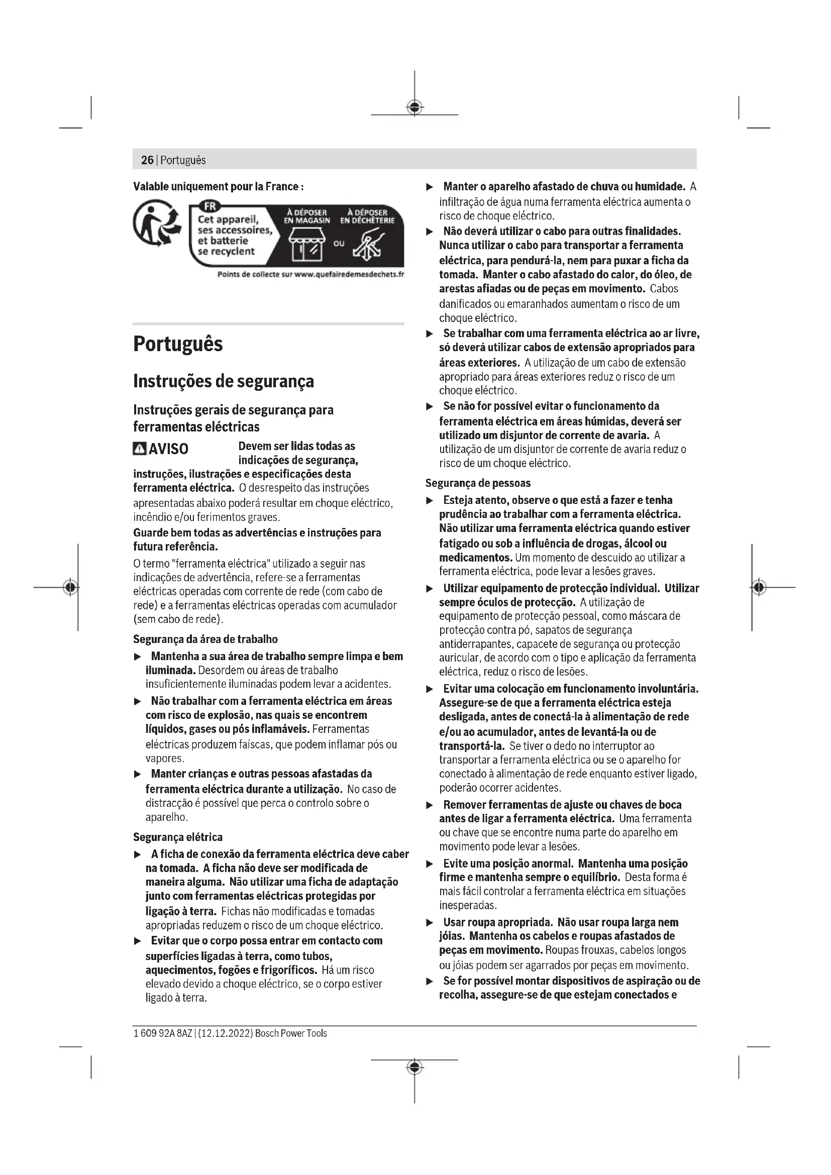 O nível de vibrações indicado nestas instruções e o valor de emissões sonoras foram medidos de acordo com um processo de medição normalizado e podem ser utilizados para a comparação de ferramentas elétricas. Também são adequados para uma avaliação provisória das emissões sonoras e de vibrações. O nível de vibrações indicado e o valor de emissões sonoras representam as aplicações principais da ferramenta elétrica. Se a ferramenta elétrica for utilizada para outras aplicações, com outras ferramentas de trabalho ou com manutenção insuficiente, é possível que o nível de vibrações e de emissões sonoras seja diferente. Isto pode aumentar sensivelmente a emissão sonora e de vibrações para o período completo de trabalho. Para uma estimação exata da emissão sonora e de vibrações, também deveriam ser considerados os períodos nos quais o aparelho está desligado ou funciona, mas não está sendo utilizado. Isto pode reduzir a emissão sonora e de vibrações durante o completo período de trabalho. Além disso também deverão ser estipuladas medidas de segurança para proteger o operador contra o efeito de vibrações, como por exemplo: manutenção de ferramentas elétricas e acessórios, manter as mãos quentes e organização dos processos de trabalho. Bateria Bosch vende ferramentas elétricas sem fio também sem bateria. Pode consultar na embalagem se está incluída uma bateria no volume de fornecimento da sua ferramenta elétrica. Carregar a bateria u Utilize apenas os carregadores listados nos dados técnicos. Só estes carregadores são apropriados para os baterias de lítio utilizadas para a sua ferramenta elétrica. Nota: devido a normas de transporte internacionais, as baterias de lítio são fornecidas parcialmente carregadas. Para assegurar a completa potência da bateria, a bateria deverá ser carregada completamente antes da primeira utilização. Colocar a bateria Insira a bateria carregada no respetivo encaixe, até que esta esteja engatada. Retirar a bateria Para retirar a bateria, pressione a respetiva tecla de desbloqueio e puxe a bateria para fora. Não empregue força. A bateriapossui 2 níveis de travamento, que devem evitar, que a bateria caia, caso a tecla de desbloqueio da bateriaseja premida por acaso. Enquanto a bateria estiver dentro da ferramenta elétrica, ela é mantida em posição por uma mola. Indicador do nível de carga da bateria Os LEDs verdes do indicador do nível de carga da bateria indicam o nível de carga da bateria. Por motivos de segurança, a consulta do nível de carga só é possível com a ferramenta elétrica parada. Prima a tecla para o indicador do nível de carga da bateria ou para visualizar o nível de carga. Isto também é possível com a bateria removida. Se, depois de premir a tecla para o indicador do nível de carga da bateria, não se acender qualquer LED, a bateria tem defeito e tem de ser substituída. Bosch Power Tools 1 609 92A 8AZ | (12.12.2022)30 | Português Tipo de bateria GBA 18V... LED Capacidade Luz permanente 3× verde 60–100% Luz permanente 2× verde 30–60% Luz permanente 1× verde 5–30% Luz intermitente 1× verde 0–5% Tipo de bateria ProCORE18V... LED Capacidade Luz permanente 5× verde 80–100% Luz permanente 4× verde 60–80% Luz permanente 3× verde 40–60% Luz permanente 2× verde 20–40% Luz permanente 1× verde 5–20% Luz intermitente 1× verde 0–5% Indicações sobre o manuseio ideal da bateria Proteger a bateria contra humidade e água. Armazene a bateria apenas na faixa de temperatura de −20°C a 50°C. Por exemplo, não deixe a bateria dentro do automóvel no verão. Limpar de vez em quando as aberturas de ventilação da bateria com um pincel macio, limpo e seco. Um tempo de funcionamento reduzido após o carregamento indica que a bateria está gasta e que deve ser substituída. Observe as indicações sobre a eliminação de forma ecológica. Montagem u A bateria deverá ser retirada antes de todos os trabalhos na ferramenta elétrica (p. ex. manutenção, troca de ferramenta etc.) e antes de transportar ou de armazenar a mesma. Há perigo de ferimentos se o interruptor de ligar/desligar for acionado involuntariamente. Troca de ferramenta u Use luvas de proteção ao trocar de ferramenta. Há perigo de ferimentos em caso de contacto com a ferramenta de trabalho. Selecionar acessório Tenha em atenção as ferramentas de trabalho previstas para a sua ferramenta elétrica. Ferramenta de trabalho GOP185‑LI A tabela a seguir apresenta exemplos de ferramentas de trabalho. Outras ferramentas de trabalho encontram-se no amplo programa de acessórios Bosch. Ferramenta de trabalho Material Aplicação AIZ 10 AB Starlock 10×20mm Lâmina de serra de imersão de bimetal para madeira e metal Madeira macia, plástico macio, pladur, perfis de alumínio e de metal não ferrosos de paredes finas, chapas finas, pregos e parafusos não temperados Pequenos cortes de seccionamento e imersão; trabalhos de ajuste de filigrana em madeira; Exemplo: cortar roços para cabos, cortes de imersão em placas de gesso cartonado, serragem posterior de roços para fechaduras e ferragens AIZ 32 EPC Starlock 32×50mmLâmi- na de serra de imersão HCS para madeira Madeira macia Cortes de seccionamento e imersão sem arestas graças à borda redonda da serra (Curved-Tec); também para serrar rente à borda, em cantos e áreas de difícil acesso; Exemplo: corte de imersão para a montagem de uma grelha de ventilação ou cortar roços para tomadas AIZ 32 APB/ AIZ 32 APIB Starlock 32× 50mmLâmi- na de serra de imersão de bimetal Materiais compostos em madeira e metais macios não ferrosos, pregos e parafusos não temperados, tubos em metal não ferroso e perfis Cortes sem arestas, à face e cortes de imersão em madeira, metais macios não ferrosos e plástico graças à borda redonda da serra (Curved-Tec); Exemplo: roços para tomadas e tubos, cortar à face pregos e parafusos