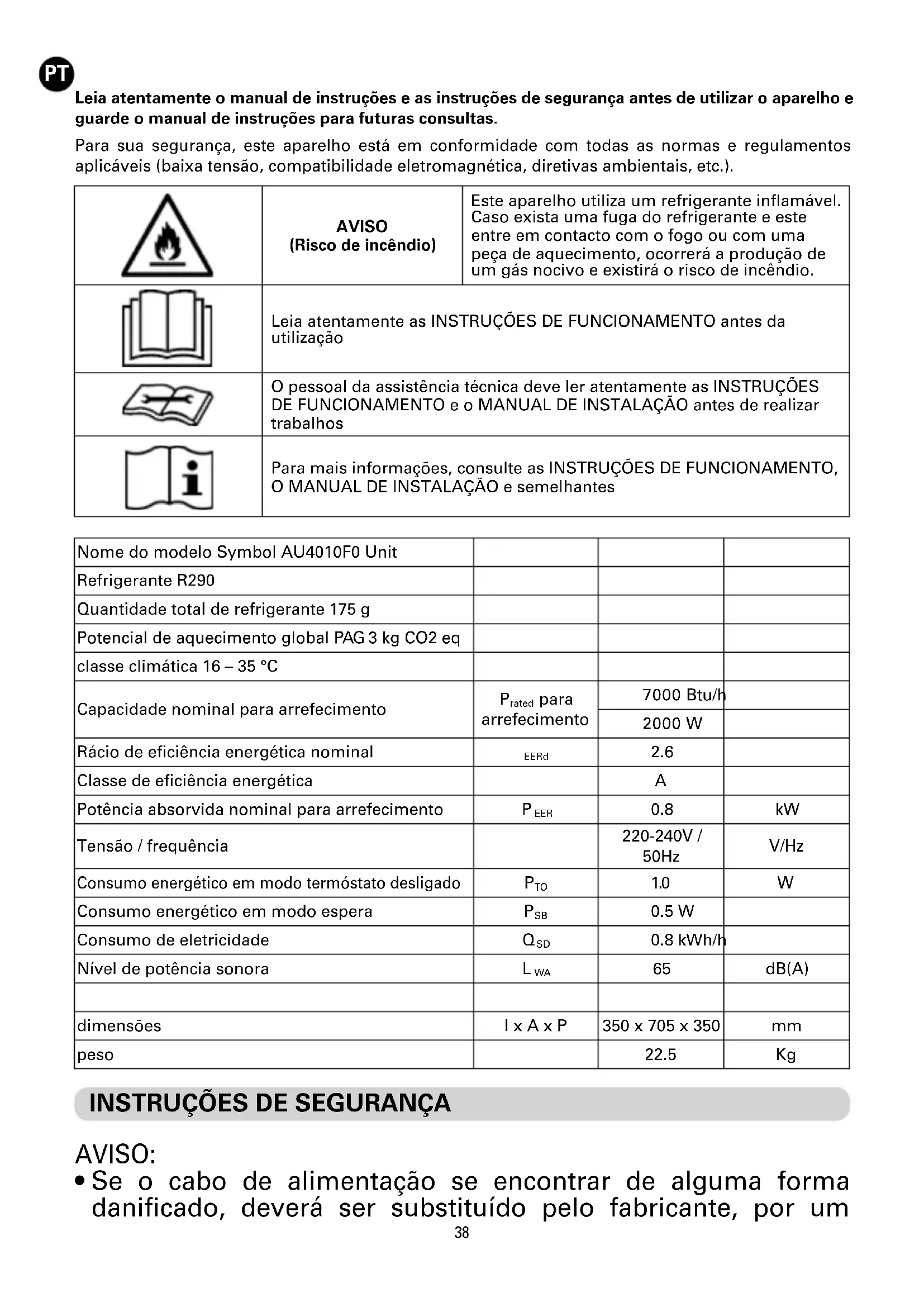 Leia atentamente o manual de instruções e as instruções de segurança antes de utilizar o aparelho e guarde o manual de instruções para futuras consultas. Para sua segurança, este aparelho está em conformidade com todas as normas e regulamentos aplicáveis (baixa tensão, compatibilidade eletromagnética, diretivas ambientais, etc.). AVISO (Risco de incêndio) Este aparelho utiliza um refrigerante inflamável. Caso exista uma fuga do refrigerante e este entre em contacto com o fogo ou com uma peça de aquecimento, ocorrerá a produção de um gás nocivo e existirá o risco de incêndio. Leia atentamente as INSTRUÇÕES DE FUNCIONAMENTO antes da utilização O pessoal da assistência técnica deve ler atentamente as INSTRUÇÕES DE FUNCIONAMENTO e o MANUAL DE INSTALAÇÃO antes de realizar trabalhos Para mais informações, consulte as INSTRUÇÕES DE FUNCIONAMENTO, O MANUAL DE INSTALAÇÃO e semelhantes Nome do modelo Symbol AU4010F0 Unit Refrigerante R290 Quantidade total de refrigerante 175 g Potencial de aquecimento global PAG 3 kg CO2 eq classe climática 16 – 35 °C Capacidade nominal para arrefecimento