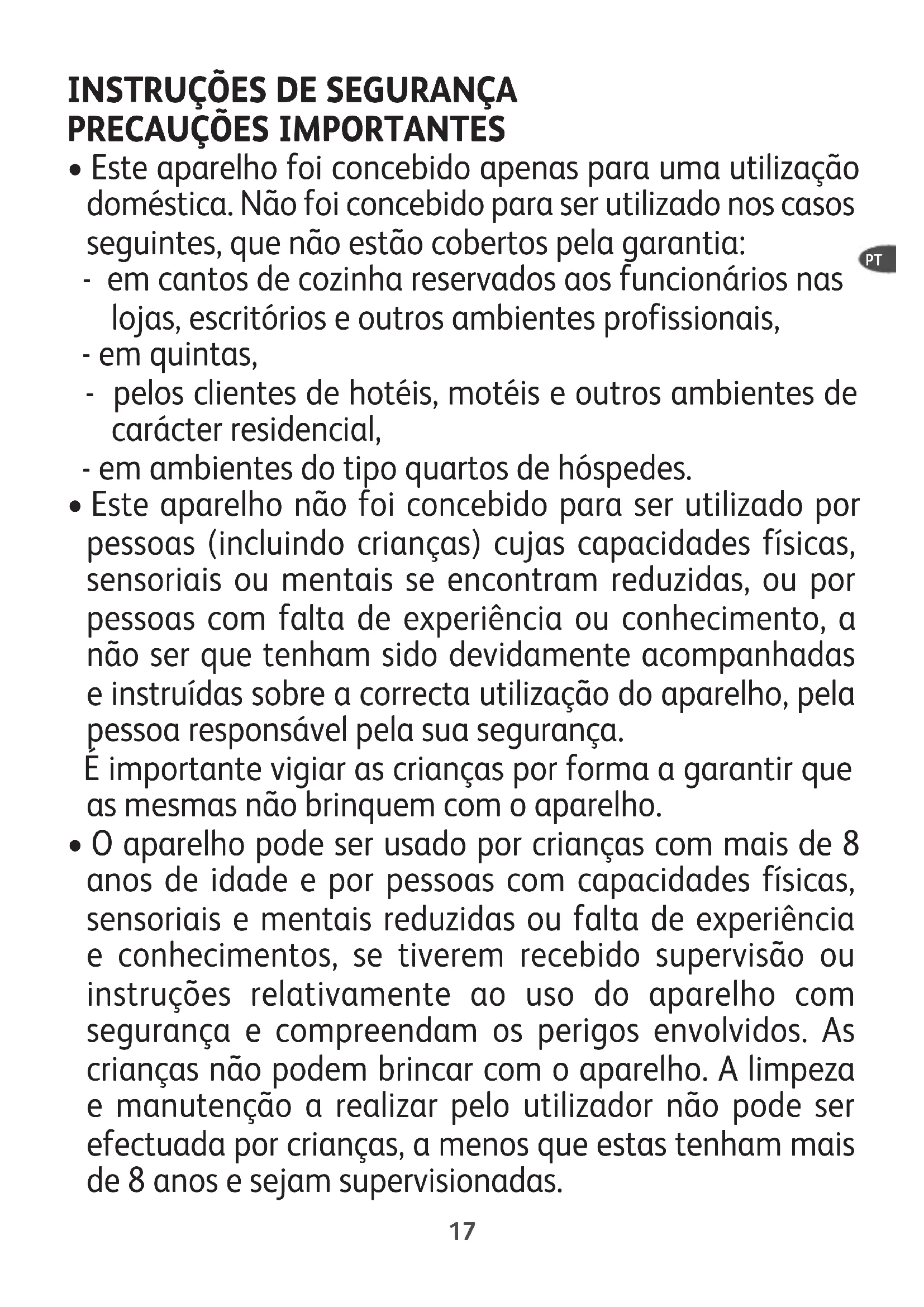 - Antes de deitar fora o aparelho, deve retirar a pilha do temporizador e depositá-la num centro de recolha especializado ou num Serviço de Assistência Técnica autorizado (consoante o modelo). Conselho/informação Protecção do ambiente em primeiro lugar! O seu produto contém materiais que podem ser recuperados ou reciclados. Entregue-o num ponto de recolha para possibilitar o seu tratamento. Ambiente PT20 SAFETY INSTRUCTIONS IMPORTANT SAFEGUARDS