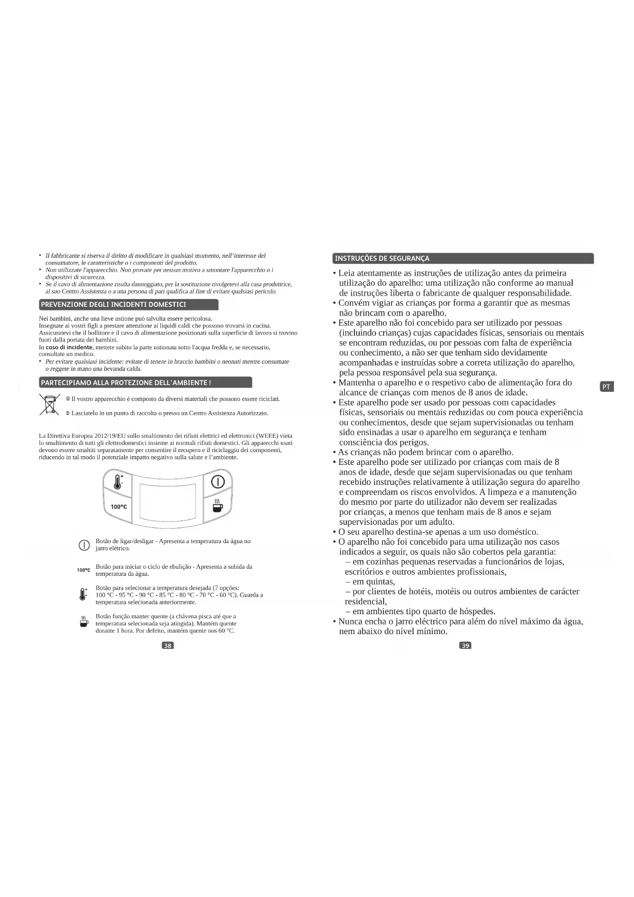 Botão de ligar/desligar - Apresenta a temperatura da água no jarro elétrico. Botão para iniciar o ciclo de ebulição - Apresenta a subida da temperatura da água. Botão para selecionar a temperatura desejada (7 opções: 100 °C - 95 °C - 90 °C - 85 °C - 80 °C - 70 °C - 60 °C). Guarda a temperatura selecionada anteriormente. Botão função manter quente (a chávena pisca até que a temperatura selecionada seja atingida). Mantém quente durante 1 hora. Por defeito, mantém quente nos 60 °C. La Direttiva Europea 2012/19/EU sullo smaltimento dei rifiuti elettrici ed elettronici (WEEE) vieta lo smaltimento di tutti gli elettrodomestici insieme ai normali rifiuti domestici. Gli apparecchi usati devono essere smaltiti separatamente per consentire il recupero e il riciclaggio dei componenti, riducendo in tal modo il potenziale impatto negativo sulla salute e l’ambiente.4140