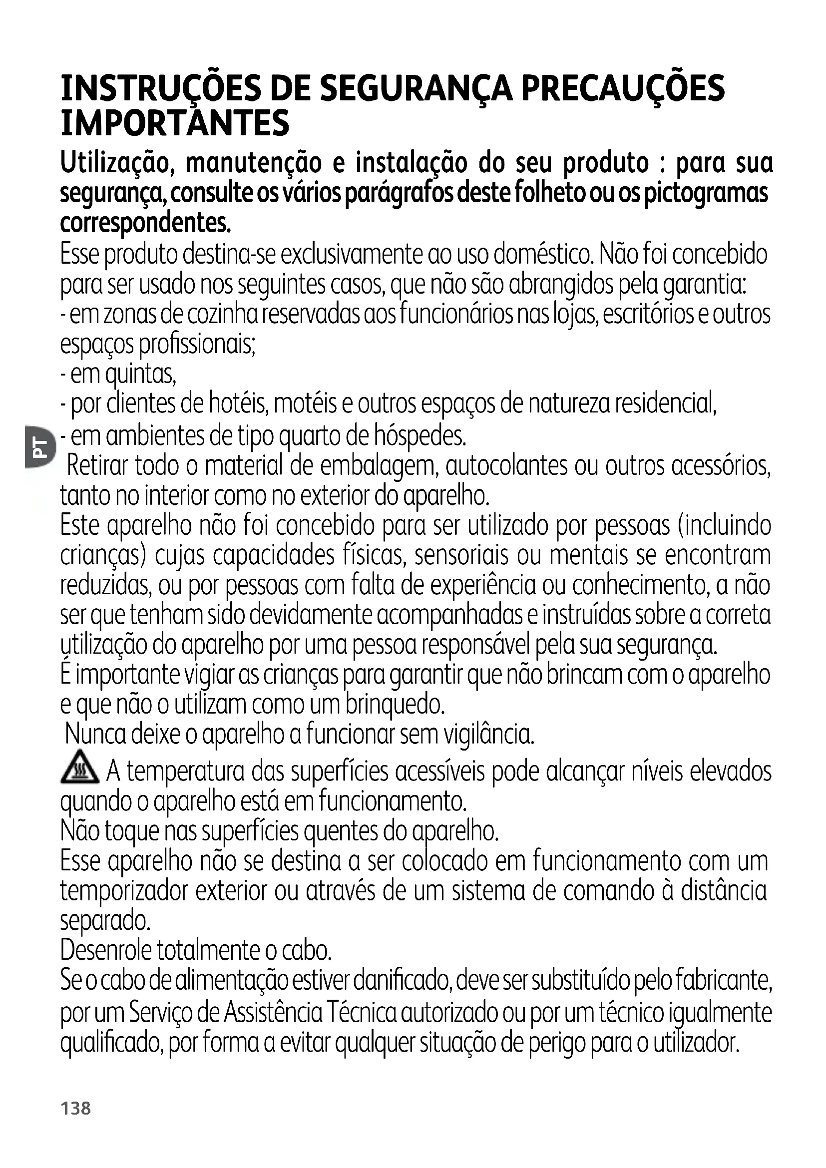 - Para una cocción óptima, coloque el lado redondeado del tomate cortado por la mitad sobre la placa inferior del grill. CERDO * Utilice la función Churrascar si el grosor es superior a 20 mm. ES138 INSTRUÇÕES DE SEGURANÇA PRECAUÇÕES IMPORTANTES Utilização, manutenção e instalação do seu produto : para sua segurança, consulte os vários parágrafos deste folheto ou os pictogramas correspondentes. Esse produto destina-se exclusivamente ao uso doméstico. Não foi concebido para ser usado nos seguintes casos, que não são abrangidos pela garantia: - em zonas de cozinha reservadas aos funcionários nas lojas, escritórios e outros espaços profissionais; - em quintas, - por clientes de hotéis, motéis e outros espaços de natureza residencial, - em ambientes de tipo quarto de hóspedes. Retirar todo o material de embalagem, autocolantes ou outros acessórios, tanto no interior como no exterior do aparelho. Este aparelho não foi concebido para ser utilizado por pessoas (incluindo crianças) cujas capacidades físicas, sensoriais ou mentais se encontram reduzidas, ou por pessoas com falta de experiência ou conhecimento, a não ser que tenham sido devidamente acompanhadas e instruídas sobre a correta utilização do aparelho por uma pessoa responsável pela sua segurança. É importante vigiar as crianças para garantir que não brincam com o aparelho e que não o utilizam como um brinquedo. Nunca deixe o aparelho a funcionar sem vigilância. A temperatura das superfícies acessíveis pode alcançar níveis elevados quando o aparelho está em funcionamento. Não toque nas superfícies quentes do aparelho. Esse aparelho não se destina a ser colocado em funcionamento com um temporizador exterior ou através de um sistema de comando à distância separado. Desenrole totalmente o cabo. Se o cabo de alimentação estiver danificado, deve ser substituído pelo fabricante, por um Serviço de Assistência Técnica autorizado ou por um técnico igualmente qualificado, por forma a evitar qualquer situação de perigo para o utilizador. PT139 Se utilizar uma extensão elétrica, esta deve ter uma secção pelo menos equivalente, e ter uma tomada com ligação de terra incorporada. Tome as devidas precauções para que ninguém tropece. O aparelho apenas deve ser ligado a uma tomada com ligação à terra incorporada. Certifique-se de que a instalação elétrica é compatível com a potência e a tensão indicadas por baixo do aparelho. Este aparelho não pode ser mergulhado em líquidos. Nunca mergulhe o aparelho nem o cabo em água. O aparelho pode ser utilizado por crianças a partir dos 8 anos ou mais e por pessoas com capacidades físicas, sensoriais e mentais reduzidas ou falta de experiência e conhecimentos, desde que tenham sido devidamente acompanhadas e instruídas sobre a utilização do aparelho em segurança e que compreendam os perigos envolvidos. A limpeza e a manutenção do mesmo por parte do utilizador não devem ser realizadas por crianças, a não ser que tenham mais de 8 anos e sejam supervisionadas. Mantenha o aparelho e o cabo de alimentação fora do alcance das crianças com menos de 8 anos. ATENÇÃO : Não aqueça nem preaqueça o grelhador sem as duas placas colocadas no interior. O que pode fazer