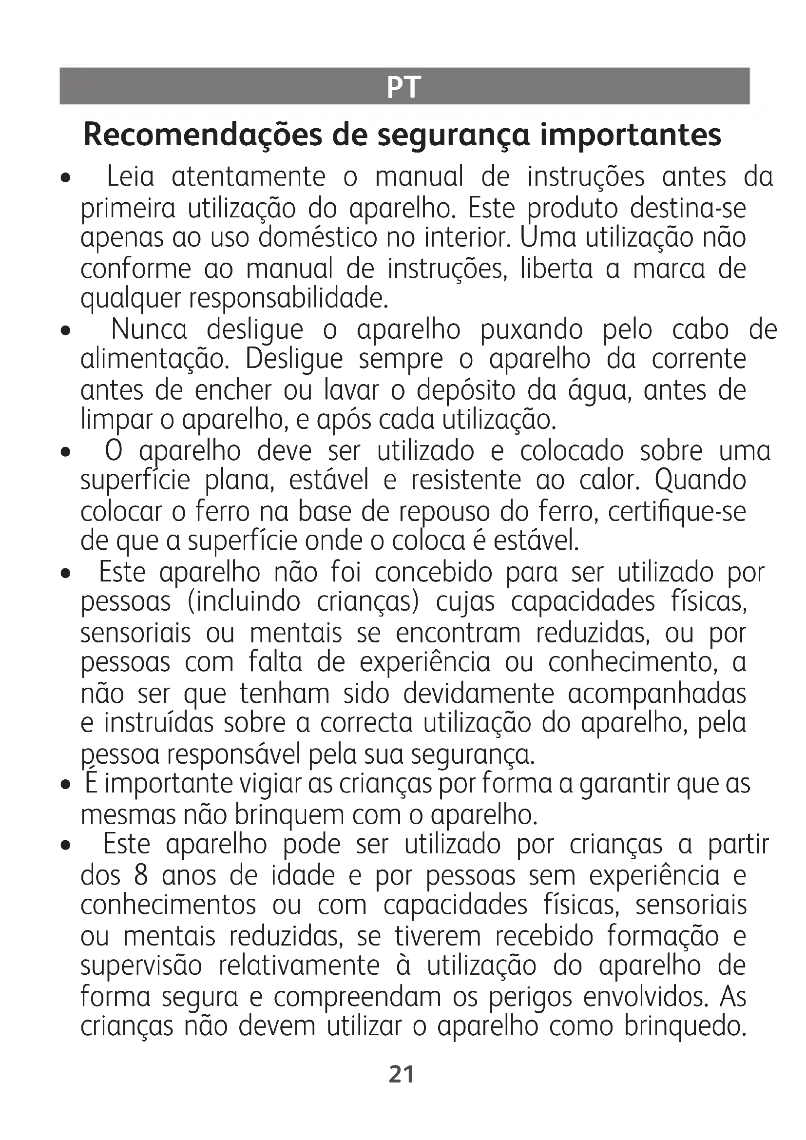 - Este aparelho pode ser utilizado por crianças a partir dos 8 anos de idade e por pessoas sem experiência e conhecimentos ou com capacidades físicas, sensoriais ou mentais reduzidas, se tiverem recebido formação e supervisão relativamente à utilização do aparelho de forma segura e compreendam os perigos envolvidos. As crianças não devem utilizar o aparelho como brinquedo. 21As tarefas de limpeza e manutenção não devem ser efetuadas por crianças sem supervisão. Mantenha o ferro de engomar e o respetivo cabo de alimentação fora do alcance das crianças com idade inferior a 8 anos, sempre que o aparelho se encontrar ligado ou a arrefecer.