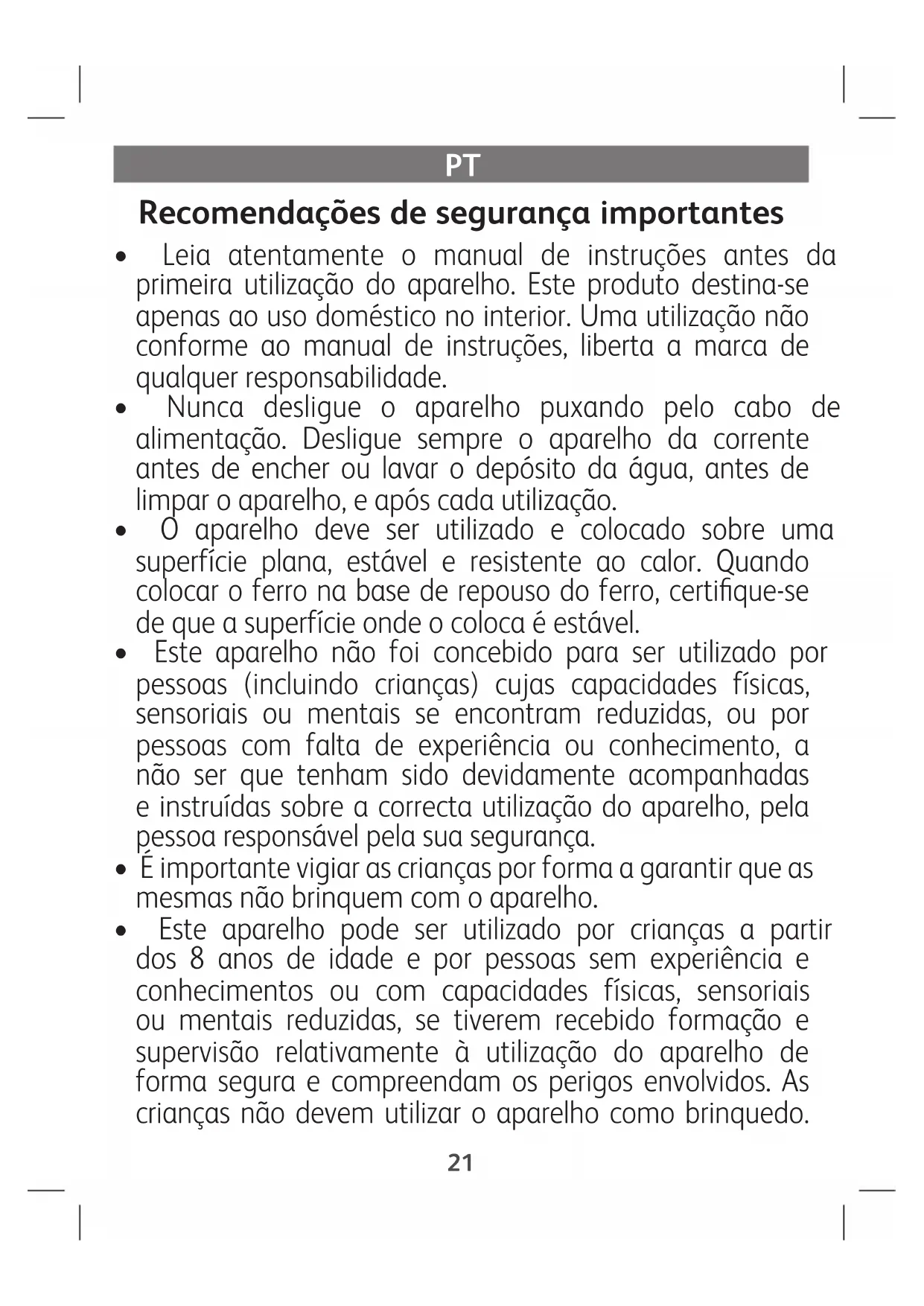 - Este aparelho pode ser utilizado por crianças a partir dos 8 anos de idade e por pessoas sem experiência e conhecimentos ou com capacidades físicas, sensoriais ou mentais reduzidas, se tiverem recebido formação e supervisão relativamente à utilização do aparelho de forma segura e compreendam os perigos envolvidos. As crianças não devem utilizar o aparelho como brinquedo. 21As tarefas de limpeza e manutenção não devem ser efetuadas por crianças sem supervisão. Mantenha o ferro de engomar e o respetivo cabo de alimentação fora do alcance das crianças com idade inferior a 8 anos, sempre que o aparelho se encontrar ligado ou a arrefecer.