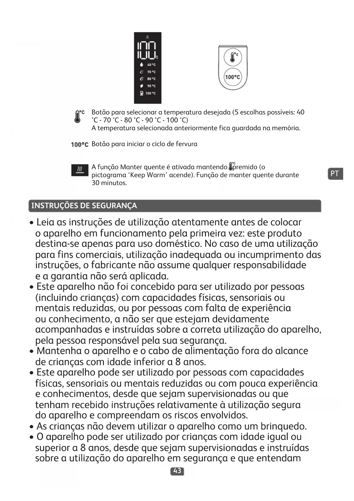 Botão para selecionar a temperatura desejada (5 escolhas possíveis: 40 °C - 70 °C - 80 °C - 90 °C - 100 °C) A temperatura selecionada anteriormente fica guardada na memória. Botão para iniciar o ciclo de fervura A função Manter quente é ativada mantendo premido (o pictograma ‘Keep Warm’ acende). Função de manter quente durante 30 minutos.44 perfeitamente os perigos inerentes a este aparelho. As crianças não deverão limpar nem efetuar a manutenção do aparelho, a não ser que tenham idade igual ou superior a 8 anos ou sejam supervisionadas por um adulto.