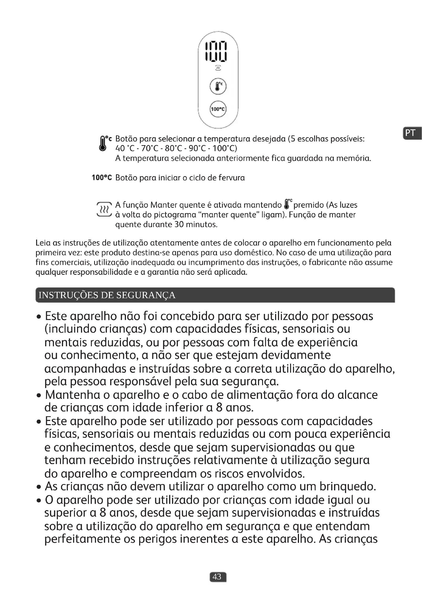 Botão para selecionar a temperatura desejada (5 escolhas possíveis: 40°C - 70°C - 80°C - 90°C - 100°C) A temperatura selecionada anteriormente fica guardada na memória. Botão para iniciar o ciclo de fervura A função Manter quente é ativada mantendo premido (As luzes à volta do pictograma “manter quente” ligam). Função de manter quente durante 30 minutos. Leia as instruções de utilização atentamente antes de colocar o aparelho em funcionamento pela primeira vez: este produto destina-se apenas para uso doméstico. No caso de uma utilização para fins comerciais, utilização inadequada ou incumprimento das instruções, o fabricante não assume qualquer responsabilidade eagarantia não será aplicada.44 não deverão limpar nem efetuar a manutenção do aparelho, a não ser que tenham idade igual ou superior a 8 anos ou sejam supervisionadas por um adulto.
