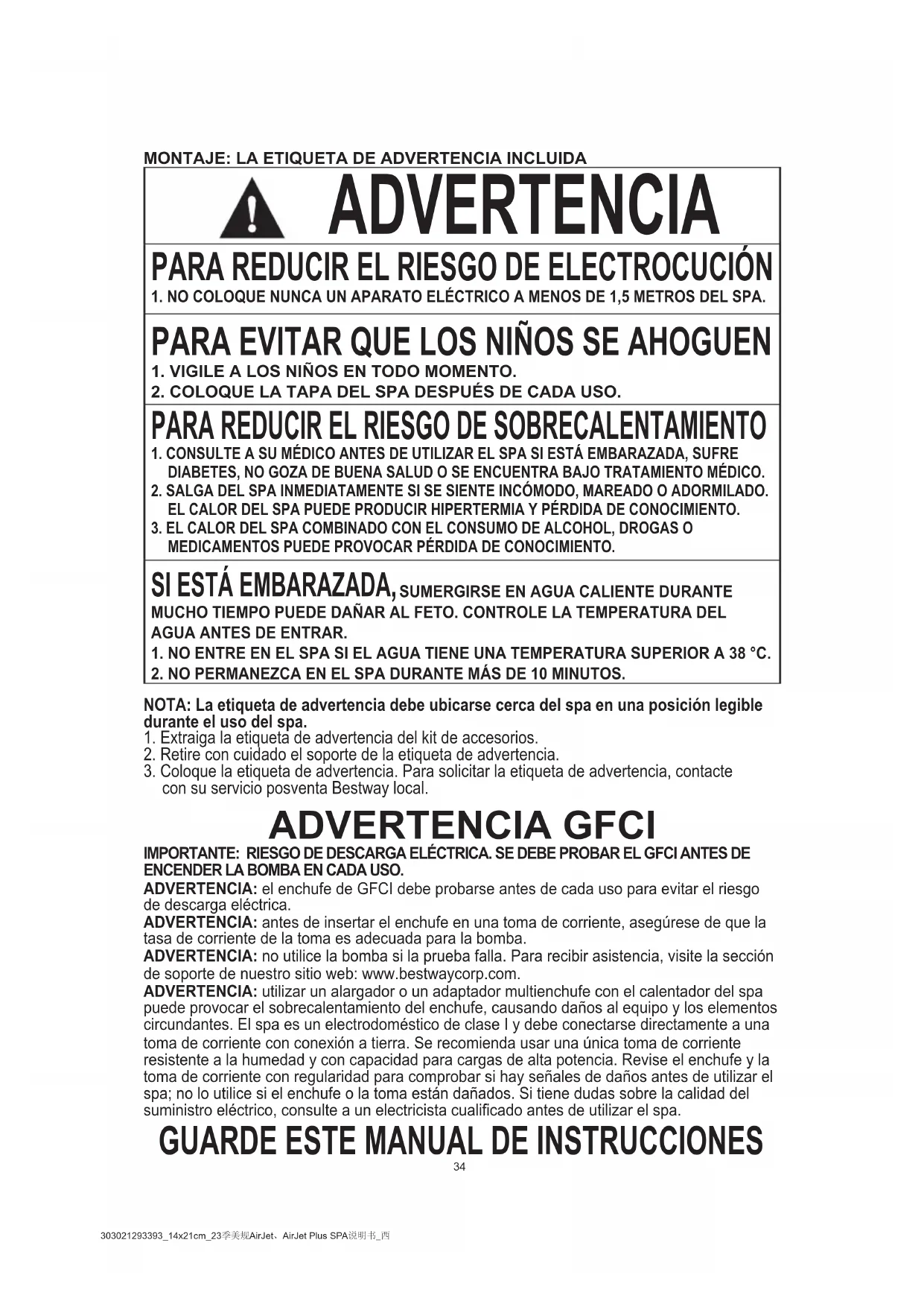 303021293393_14x21cm_23季美规AirJet、AirJet Plus SPA说明书_西 El módulo Wi-Fi está dañado Para obtener ayuda, por favor visite la sección de soporte en nuestra página web, www.bestwaycorp.com.AVISO: Pulse cualquier botón para quitar la alarma y seguir utilizando el spa.La conexión del módulo Wi-Fi ha fallado.INSTRUÇÕES DE SEGURANÇA IMPORTANTES LEIA E SIGA TODAS AS INSTRUÇÕES. Leia cuidadosamente, compreenda e siga todas as informações deste manual do utilizador antes de instalar e utilizar o spa. Estes avisos, instruções e diretrizes de segurança abordam alguns riscos comuns de recreação na água, mas não podem abranger todos os riscos e perigos em todos os casos. Use sempre cautela, senso comum e bom senso ao desfrutar de qualquer atividade aquática. Conserve esta informação para uso futuro. Além disso, as seguintes informações podem ser fornecidas dependendo do tipo de spa. Guarde estas instruções num local seguro. Se faltarem instruções, por favor contate o fabricante ou pesquise no site www.bestwaycorp.com.