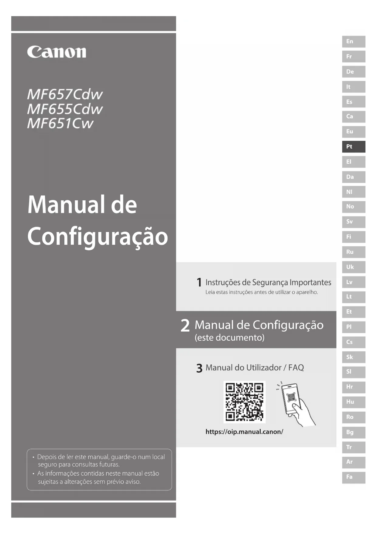 - Depois de ler este manual, guarde-o num local seguro para consultas futuras.• As informações contidas neste manual estão sujeitas a alterações sem prévio aviso.https://oip.manual.canon/ Instruções de Segurança ImportantesLeia estas instruções antes de utilizar o aparelho. Manual do Utilizador / FAQ