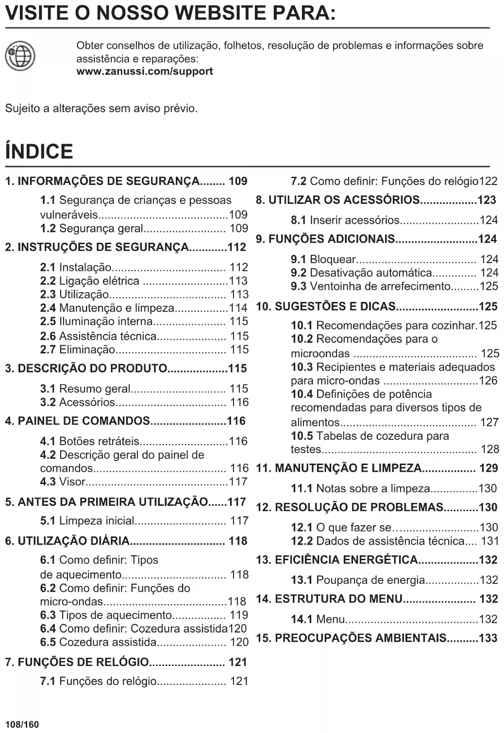 Recicle os materiais que apresentem o símbolo . Coloque a embalagem nos contentores indicados para reciclagem. Ajude a proteger o ambiente e a saúde pública através da reciclagem dos aparelhos eléctricos e electrónicos. Não elimine os aparelhos que tenham o símbolo juntamente com os resíduos domésticos. Coloque o produto num ponto de recolha para reciclagem local ou contacte as suas autoridades municipais. 133/160 ESTRUTURA DO MENUVISITE NUESTRO SITIO WEB PARA: Obtener consejos, folletos, soluciones a problemas e información de servicio y reparación: www.zanussi.com/support Salvo modificaciones. CONTENIDO