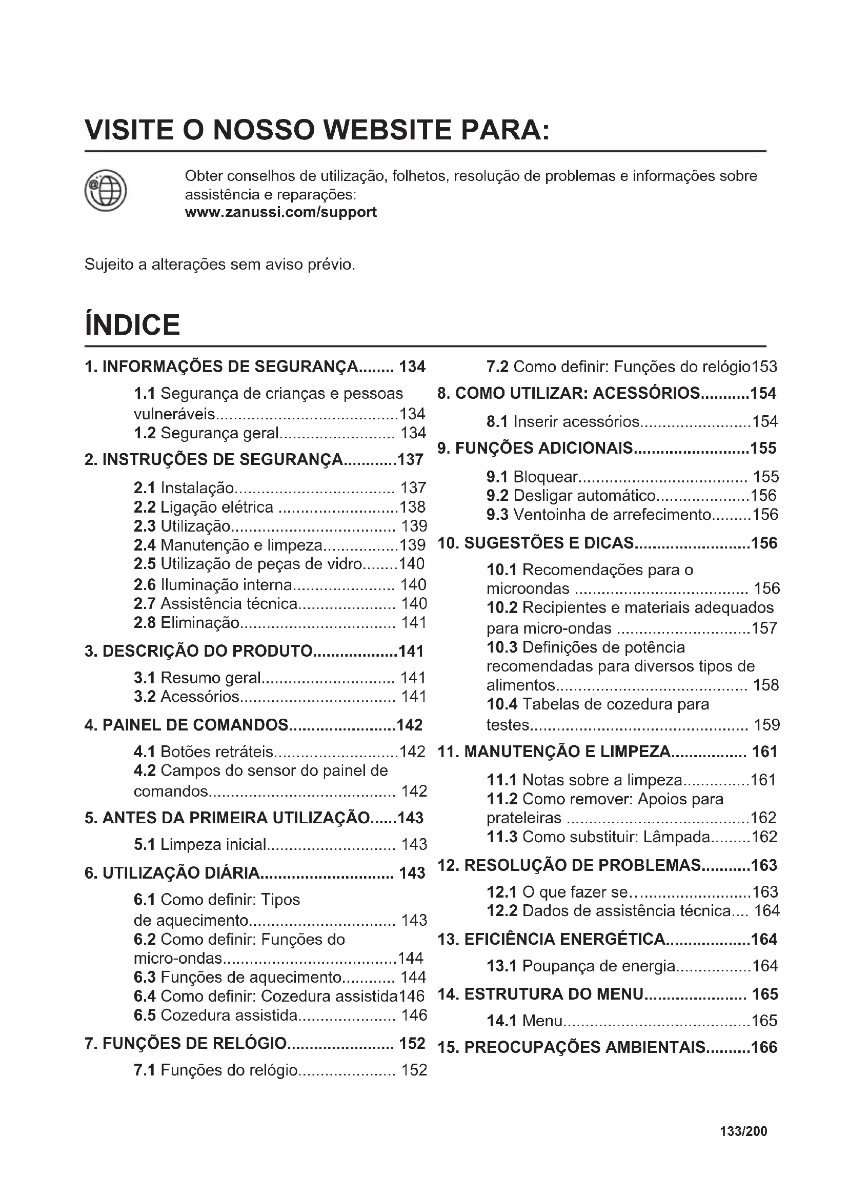 Recicle os materiais que apresentem o símbolo . Coloque a embalagem nos contentores indicados para reciclagem. Ajude a proteger o ambiente e a saúde pública através da reciclagem dos aparelhos eléctricos e electrónicos. Não elimine os aparelhos que tenham o símbolo juntamente com os resíduos domésticos. Coloque o produto num ponto de recolha para reciclagem local ou contacte as suas autoridades municipais. 166/200 ESTRUTURA DO MENUVISITE NUESTRO SITIO WEB PARA: Obtener consejos, folletos, soluciones a problemas e información de servicio y reparación: www.zanussi.com/support Salvo modificaciones. CONTENIDO