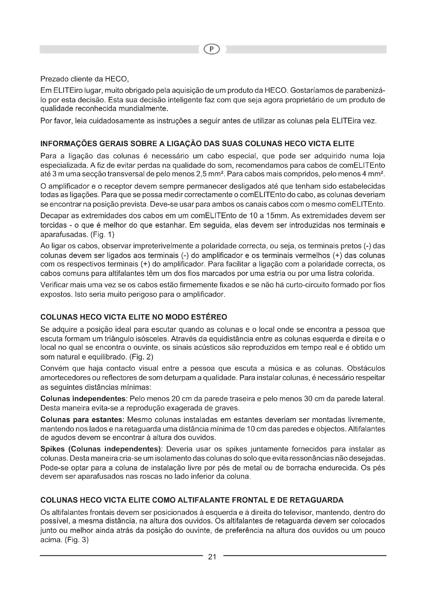 Configuración: Reflejo bajo de 3 vías Reflejo bajo de 2 vías Resistencia: 170 / 300 vatios 80 / 150 vatios Impedancia: 4 – 8 ohmios 4 – 8 ohmios Gama de frecuencias: 25 – 40 000 Hz 35 – 40 000 Hz Potencia recomendada del amplificador: 30 – 300 vatios 20 – 150 vatios Rendimiento (1 vatio/1 m): 91 dB 90 dB Dimensiones (an x al x pr): 230 x 1050 x 330 mm 480 x 162 x 260 mm Accesorios: Puntas de metal VICTA ELITE 302 Configuración: Reflejo bajo de 2 vías Resistencia: 80 / 150 vatios Impedancia: 4 – 8 ohmios Gama de frecuencias: 33 – 40 000 Hz Potencia recomendada del amplificador: 30 – 150 vatios Rendimiento (1 vatio/1 m): 90 dB Dimensiones (an x al x pr): 202 x 352 x 310 mm VICTA ELITE 202 Configuración: Reflejo bajo de 2 vías Resistencia: 65 / 120 vatios Impedancia: 4 – 8 ohmios Gama de frecuencias: 35 – 40 000 Hz Potencia recomendada del amplificador: 20 – 120 vatios Rendimiento (1 vatio/1 m): 89 dB Dimensiones (an x al x pr): 175 x 292 x 225 mm RESERVADOS LOS DERECHOS DE REALIZAR CAMBIOS TÉCNICOS. 20Prezado cliente da HECO, Em ELITEiro lugar, muito obrigado pela aquisição de um produto da HECO. Gostaríamos de parabenizá- lo por esta decisão. Esta sua decisão inteligente faz com que seja agora proprietário de um produto de qualidade reconhecida mundialmente. Por favor, leia cuidadosamente as instruções a seguir antes de utilizar as colunas pela ELITEira vez. INFORMAÇÕES GERAIS SOBRE A LIGAÇÃO DAS SUAS COLUNAS HECO VICTA ELITE Para a ligação das colunas é necessário um cabo especial, que pode ser adquirido numa loja especializada. A fiz de evitar perdas na qualidade do som, recomendamos para cabos de comELITEnto até 3 m uma secção transversal de pelo menos 2,5 mm². Para cabos mais compridos, pelo menos 4 mm². O amplificador e o receptor devem sempre permanecer desligados até que tenham sido estabelecidas todas as ligações. Para que se possa medir correctamente o comELITEnto do cabo, as colunas deveriam se encontrar na posição prevista. Deve-se usar para ambos os canais cabos com o mesmo comELITEnto. Decapar as extremidades dos cabos em um comELITEnto de 10 a 15mm. As extremidades devem ser torcidas - o que é melhor do que estanhar. Em seguida, elas devem ser introduzidas nos terminais e aparafusadas. (Fig. 1) Ao ligar os cabos, observar impreterivelmente a polaridade correcta, ou seja, os terminais pretos (-) das colunas devem ser ligados aos terminais (-) do amplificador e os terminais vermelhos (+) das colunas com os respectivos terminais (+) do amplificador. Para facilitar a ligação com a polaridade correcta, os cabos comuns para altifalantes têm um dos fios marcados por uma estria ou por uma listra colorida. Verificar mais uma vez se os cabos estão firmemente fixados e se não há curto-circuito formado por fios expostos. Isto seria muito perigoso para o amplificador. COLUNAS HECO VICTA ELITE NO MODO ESTÉREO Se adquire a posição ideal para escutar quando as colunas e o local onde se encontra a pessoa que escuta formam um triângulo isósceles. Através da equidistância entre as colunas esquerda e direita e o local no qual se encontra o ouvinte, os sinais acústicos são reproduzidos em tempo real e é obtido um som natural e equilibrado. (Fig. 2) Convém que haja contacto visual entre a pessoa que escuta a música e as colunas. Obstáculos amortecedores ou reflectores de som deturpam a qualidade. Para instalar colunas, é necessário respeitar as seguintes distâncias mínimas: Colunas independentes: Pelo menos 20 cm da parede traseira e pelo menos 30 cm da parede lateral. Desta maneira evita-se a reprodução exagerada de graves. Colunas para estantes: Mesmo colunas instaladas em estantes deveriam ser montadas livremente, mantendo nos lados e na retaguarda uma distância mínima de 10 cm das paredes e objectos. Altifalantes de agudos devem se encontrar à altura dos ouvidos. Spikes (Colunas independentes): Deveria usar os spikes juntamente fornecidos para instalar as colunas. Desta maneira cria-se um isolamento das colunas do solo que evita ressonâncias não desejadas. Pode-se optar para a coluna de instalação livre por pés de metal ou de borracha endurecida. Os pés devem ser aparafusados nas roscas no lado inferior da coluna. COLUNAS HECO VICTA ELITE COMO ALTIFALANTE FRONTAL E DE RETAGUARDA Os altifalantes frontais devem ser posicionados à esquerda e à direita do televisor, mantendo, dentro do possível, a mesma distância, na altura dos ouvidos. Os altifalantes de retaguarda devem ser colocados junto ou melhor ainda atrás da posição do ouvinte, de preferência na altura dos ouvidos ou um pouco acima. (Fig. 3)