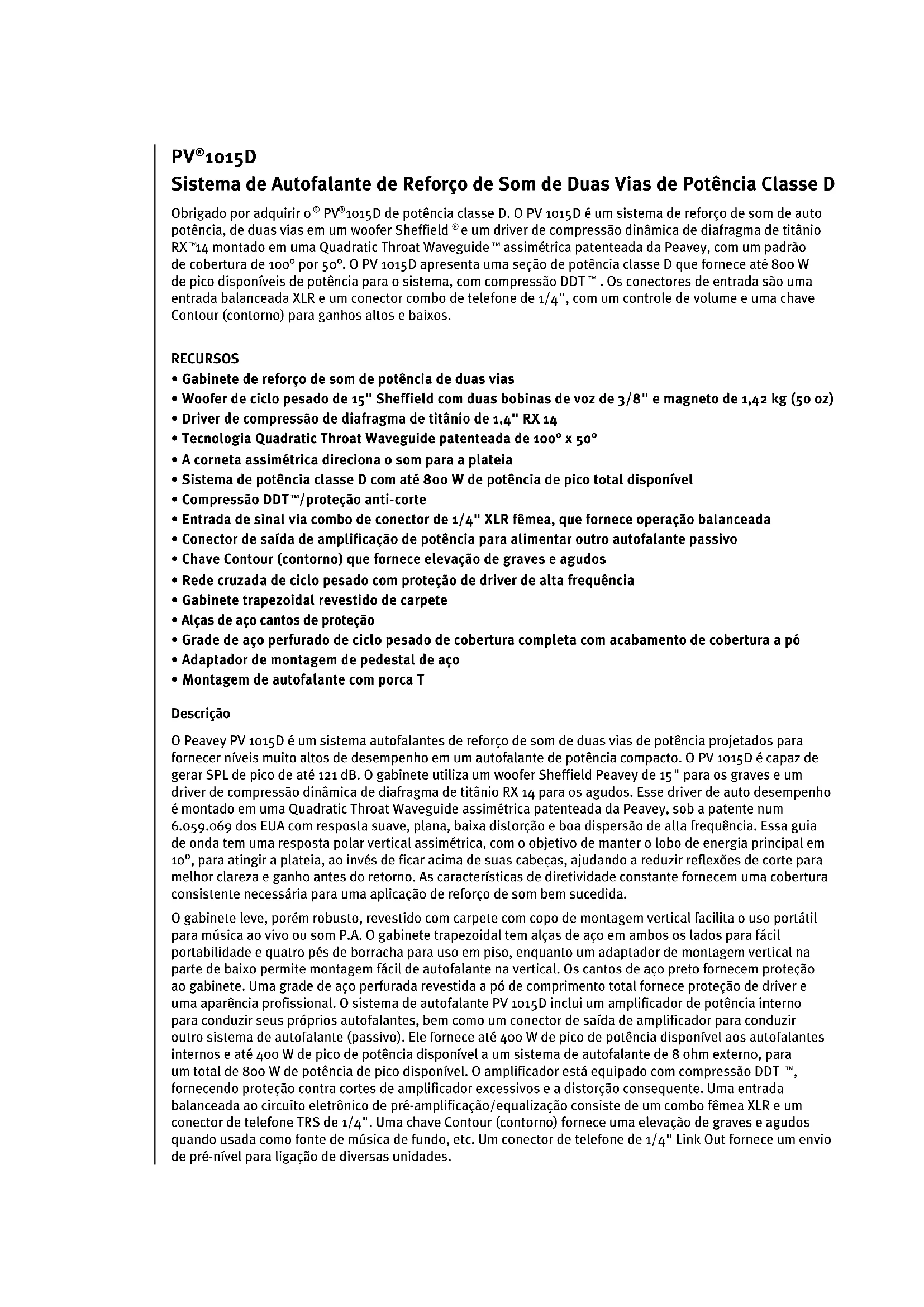 assimétrica patenteada da Peavey, com um padrão de cobertura de 100° por 50°. O PV 1015D apresenta uma seção de potência classe D que fornece até 800 W de pico disponíveis de potência para o sistema, com compressão DDT