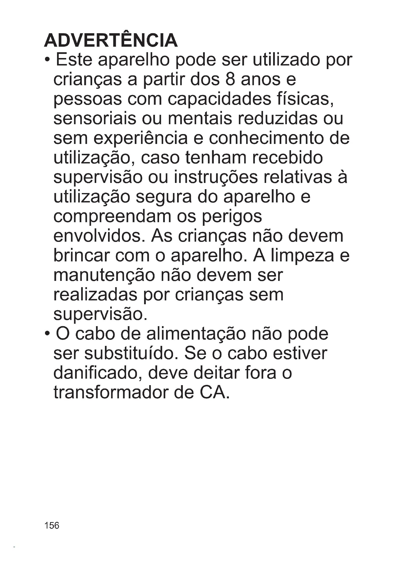 - Este aparelho pode ser utilizado por crianças a partir dos 8 anos e pessoas com capacidades físicas, sensoriais ou mentais reduzidas ou sem experiência e conhecimento de utilização, caso tenham recebido supervisão ou instruções relativas à utilização segura do aparelho e compreendam os perigos envolvidos. As crianças não devem brincar com o aparelho. A limpeza e manutenção não devem ser realizadas por crianças sem supervisão.