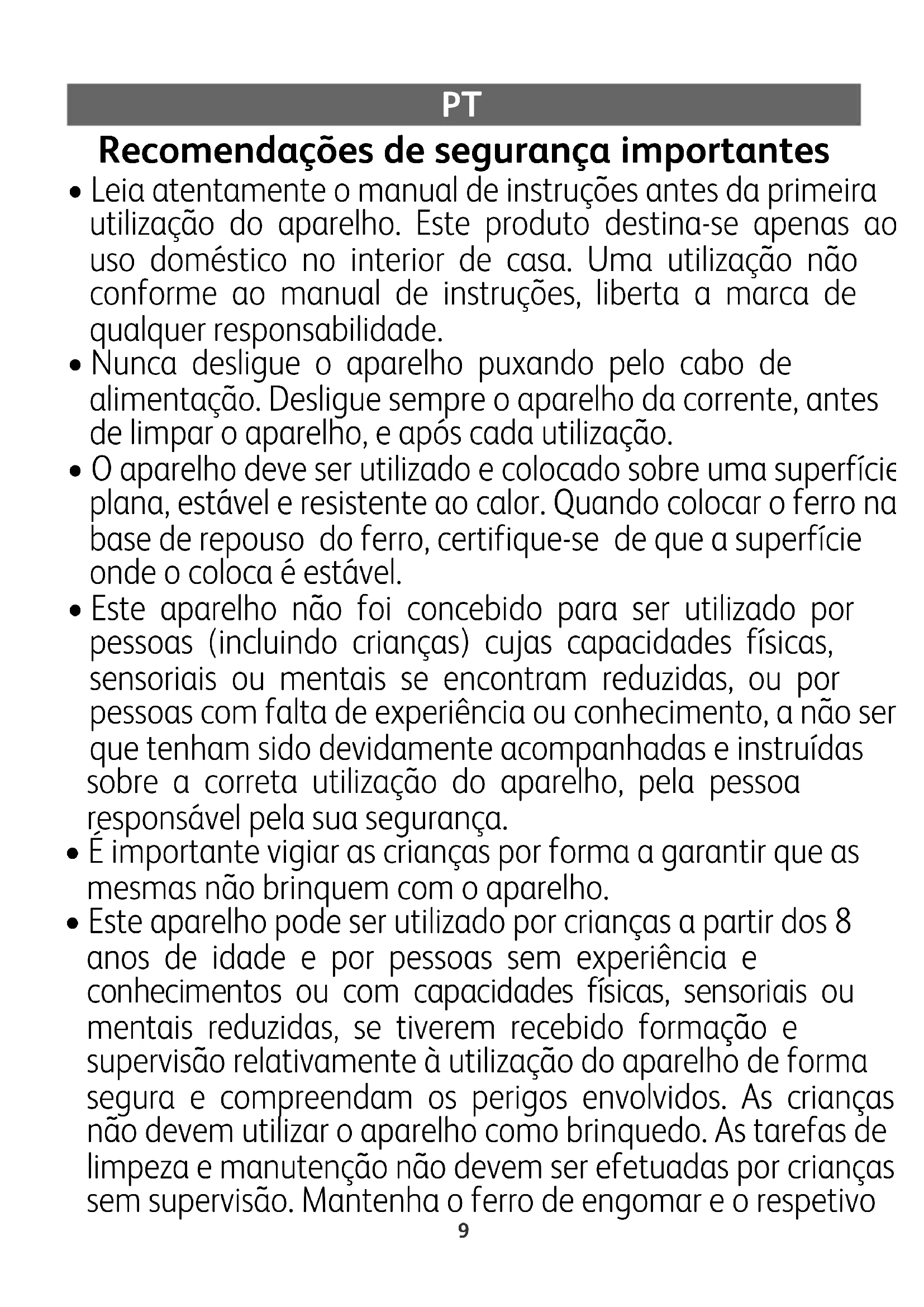 - Este aparelho pode ser utilizado por crianças a partir dos 8 anos de idade e por pessoas sem experiência e conhecimentos ou com capacidades físicas, sensoriais ou mentais reduzidas, se tiverem recebido formação e supervisão relativamente à utilização do aparelho de forma segura e compreendam os perigos envolvidos. As crianças não devem utilizar o aparelho como brinquedo. As tarefas de limpeza e manutenção não devem ser efetuadas por crianças sem supervisão. Mantenha o ferro de engomar e o respetivo 1800139279-01 FV26XX TEF.qxp_110x154 17/05/2016 16:06 Page910