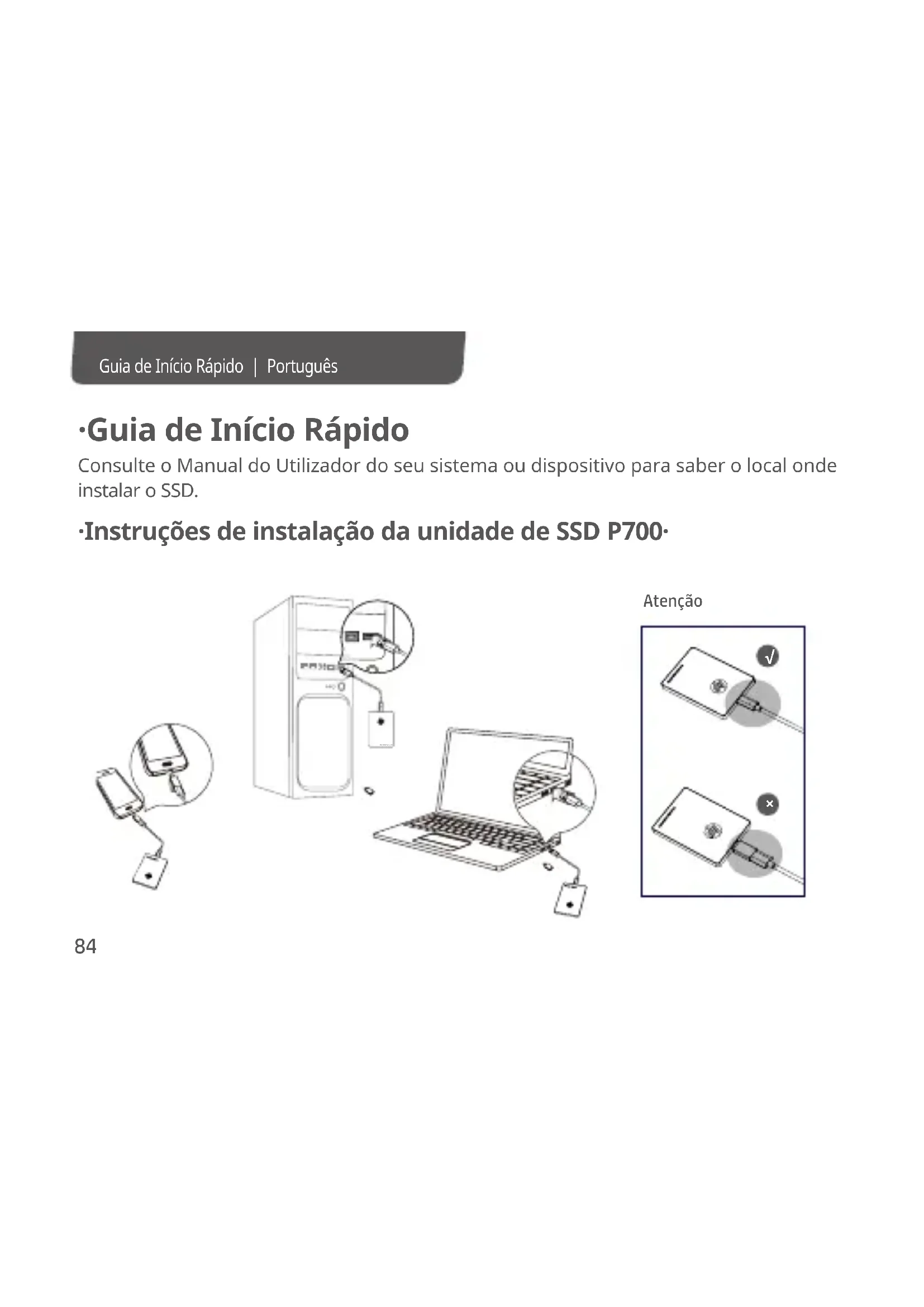 - Instruções de instalação da unidade de SSD P700· Consulte o Manual do Utilizador do seu sistema ou dispositivo para saber o local onde instalar o SSD. Portable SSD P700