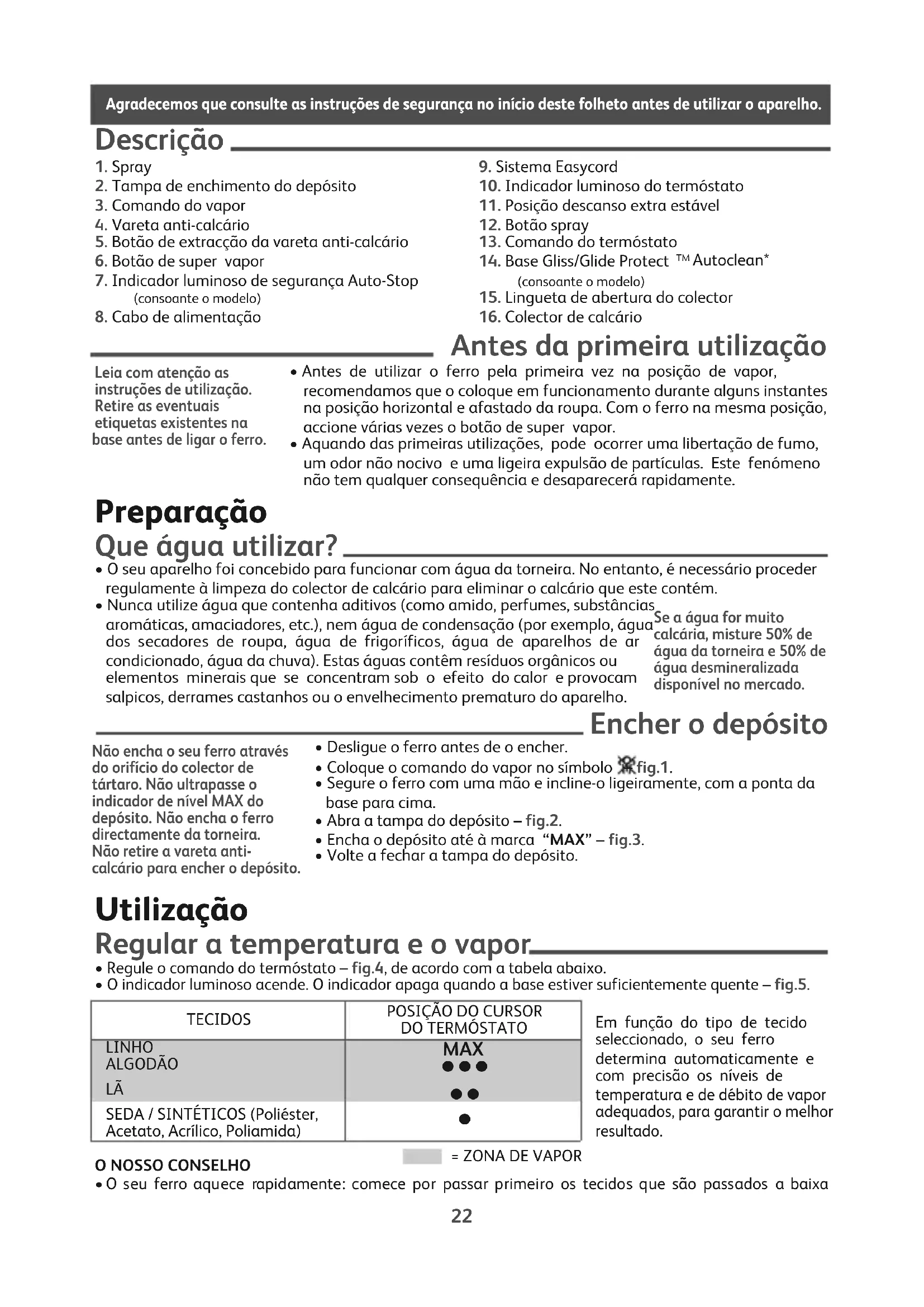 O seu ferro aquece rapidamente: comece por passar primeiro os tecidos que são passados a baixa Leia com atenção as instruções de utilização. Retire as eventuais etiquetas existentes na base antes de ligar o ferro. Não encha o seu ferro através do orifício do colector de tártaro. Não ultrapasse o indicador de nível MAX do depósito. Não encha o ferro directamente da torneira. Não retire a vareta anti- calcário para encher o depósito. Se a água for muito calcária, misture 50% de água da torneira e 50% de água desmineralizada disponível no mercado.