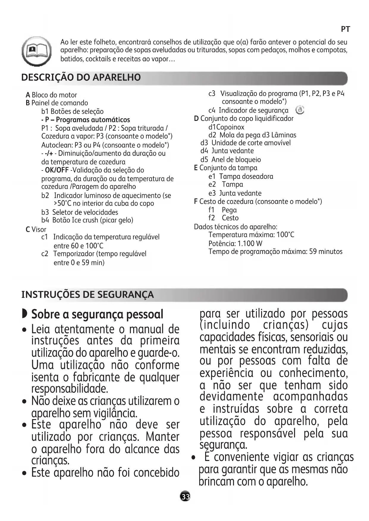 STARTSTART A Bloco do motor B Painel de comando b1 Botões de seleção - P – Programas automáticos P1 : Sopa aveludada / P2 : Sopa triturada / Cozedura a vapor: P3 (consoante o modelo*) Autoclean: P3 ou P4 (consoante o modelo*) - -/+ - Diminuição/aumento da duração ou da temperatura de cozedura - OK/OFF -Validação da seleção do programa, da duração ou da temperatura de cozedura /Paragem do aparelho b2 Indicador luminoso de aquecimento (se >50°C no interior da cuba do copo b3 Seletor de velocidades b4 Botão Ice crush (picar gelo) C Visor c1 Indicação da temperatura regulável entre 60 e 100°C c2 Temporizador (tempo regulável entre 0 e 59 min) c3 Visualização do programa (P1, P2, P3 e P4 consoante o modelo*) c4 Indicador de segurança START START D Conjunto do copo liquidificador d1 Copo inox d2 Mola da pega d3 Lâminas d3 Unidade de corte amovível d4 Junta vedante d5 Anel de bloqueio E Conjunto da tampa e1 Tampa doseadora e2 Tampa e3 Junta vedante F Cesto de cozedura (consoante o modelo*) f1 Pega f2 Cesto Dados técnicos do aparelho: Temperatura máxima: 100°C Potência: 1.100 W Tempo de programação máxima: 59 minutos