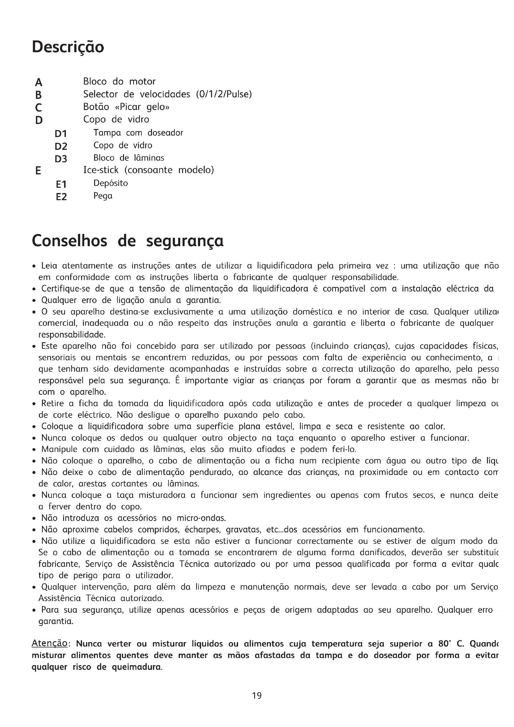 Bloco do motor Selector de velocidades (0/1/2/Pulse) Botão «Picar gelo» Copo de vidro Tampa com doseador Copo de vidro Bloco de lâminas Ice-stick (consoante modelo) Depósito Pega Conselhos de segurança