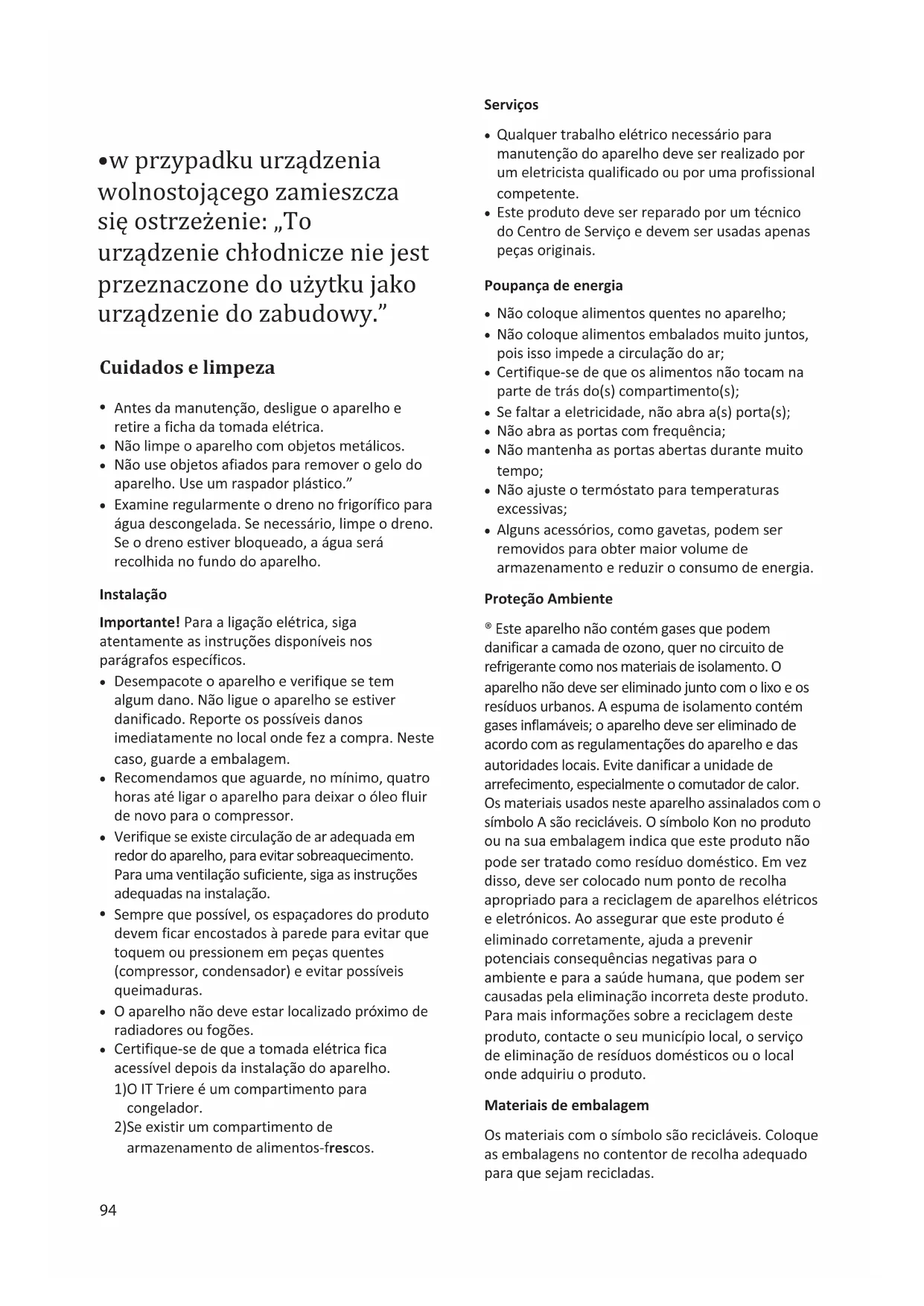 WƌŽƚĞĕĆŽŵďŝĞŶƚĞ ® Este aparelho não contém gases que podem danificar a camada de ozono, quer no circuito de refrigerante como nos materiais de isolamento. O aparelho não deve ser eliminado junto com o lixo e os resíduos urbanos. A espuma de isolamento contém gases inflamáveis; o aparelho deve ser eliminado de acordo com as regulamentações do aparelho e das autoridades locais. Evite danificar a unidade de arrefecimento, especialmente o comutador de calor. Os materiais usados neste aparelho assinalados com o símbolo A são recicláveis. O símbolo Kon no produto ou na sua embalagem indica que este produto não pode ser tratado como resíduo doméstico. Em vez disso, deve ser colocado num ponto de recolha apropriado para a reciclagem de aparelhos elétricos e eletrónicos. Ao assegurar que este produto é eliminado corretamente, ajuda a prevenir potenciais consequências negativas para o ambiente e para a saúde humana, que podem ser causadas pela eliminação incorreta deste produto. Para mais informações sobre a reciclagem deste produto, contacte o seu município local, o serviço de eliminação de resíduos domésticos ou o local onde adquiriu o produto. DĂƚĞƌŝĂŝƐĚĞĞŵďĂůĂŐĞŵ Os materiais com o símbolo são recicláveis. Coloque as embalagens no contentor de recolha adequado para que sejam recicladas.