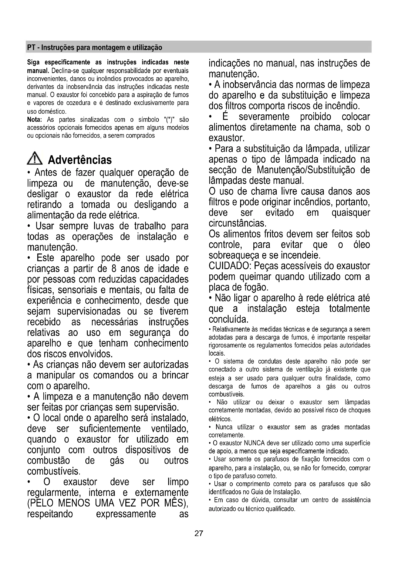 - Para a substituição da lâmpada, utilizar apenas o tipo de lâmpada indicado na secção de Manutenção/Substituição de lâmpadas deste manual. O uso de chama livre causa danos aos filtros e pode originar incêndios, portanto, deve ser evitado em quaisquer circunstâncias. Os alimentos fritos devem ser feitos sob controle, para evitar que o óleo sobreaqueça e se incendeie. CUIDADO: Peças acessíveis do exaustor podem queimar quando utilizado com a placa de fogão.