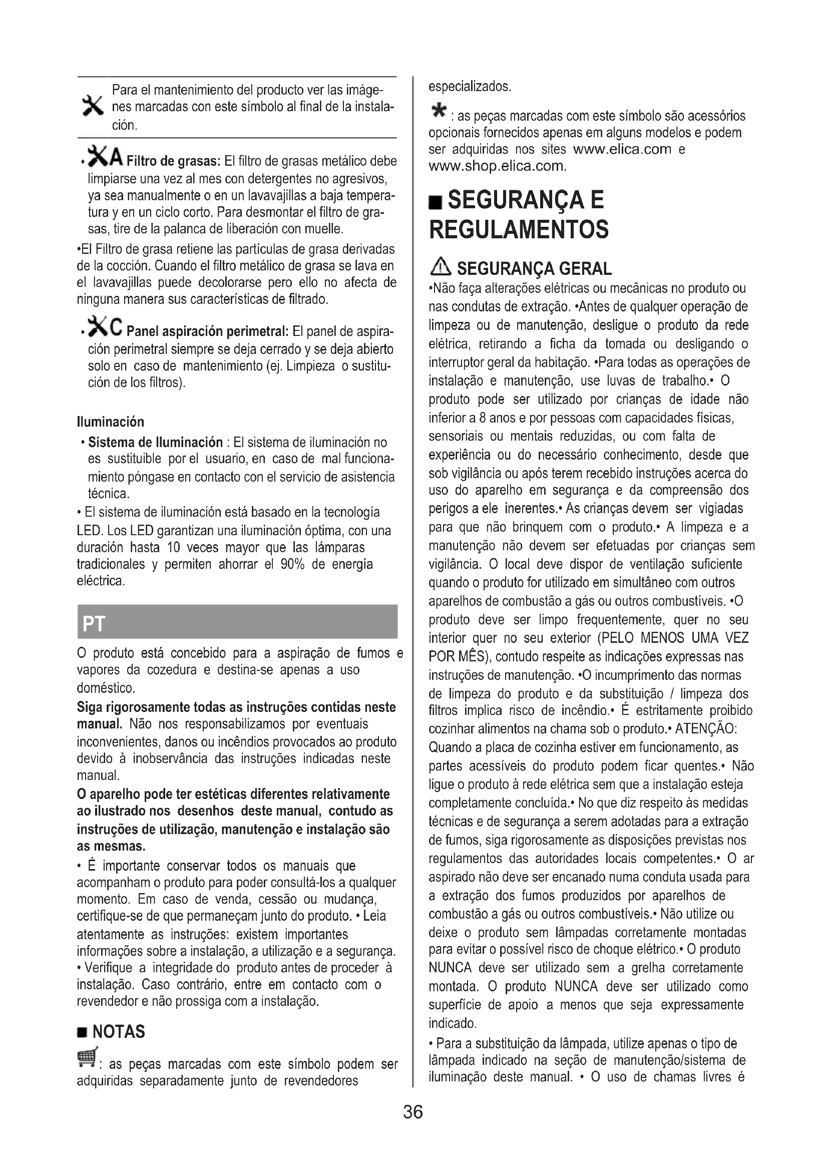 - Verifique a integridade do produto antes de proceder à instalação. Caso contrário, entre em contacto com o revendedor e não prossiga com a instalação. NOTAS : as peças marcadas com este símbolo podem ser adquiridas separadamente junto de revendedores especializados. : as peças marcadas com este símbolo são acessórios opcionais fornecidos apenas em alguns modelos e podem ser adquiridas nos sites www.elica.com e www.shop.elica.com.