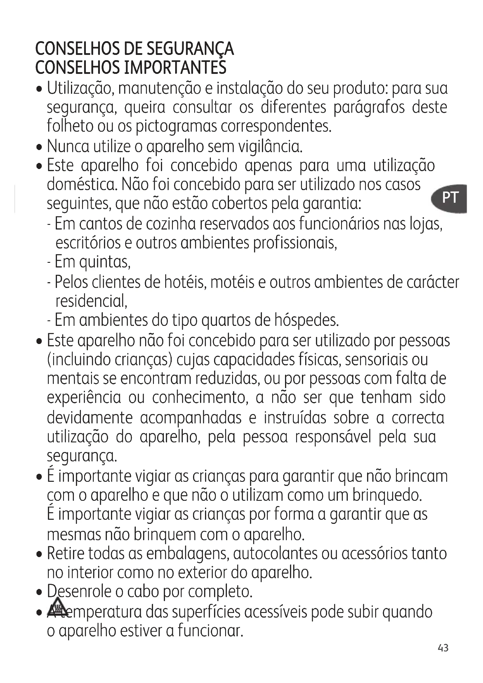 - Este aparelho não deve ser utilizado por crianças dos 0 aos 8 anos. O aparelho pode ser utilizado por crianças a partir dos 8 anos ou mais desde que sejam continuamente supervisionadas. O aparelho pode ser utilizado por pessoas com capacidades físicas, sensoriais e mentais reduzidas ou falta de experiência e conhecimentos, se tiverem recebido supervisão ou instruções relativamente ao uso do aparelho com segurança e compreendam os perigos envolvidos. Manter o aparelho e o cabo de alimentação fora do alcance de crianças com menos de 8 anos. A limpeza e a manutenção a realizar pelo utilizador não pode ser efetuada por crianças. Os aparelhos de cozedura devem ser colocados num local estável com as pegas (caso tenham) posicionadas para evitar entornar os líquidos quentes.
