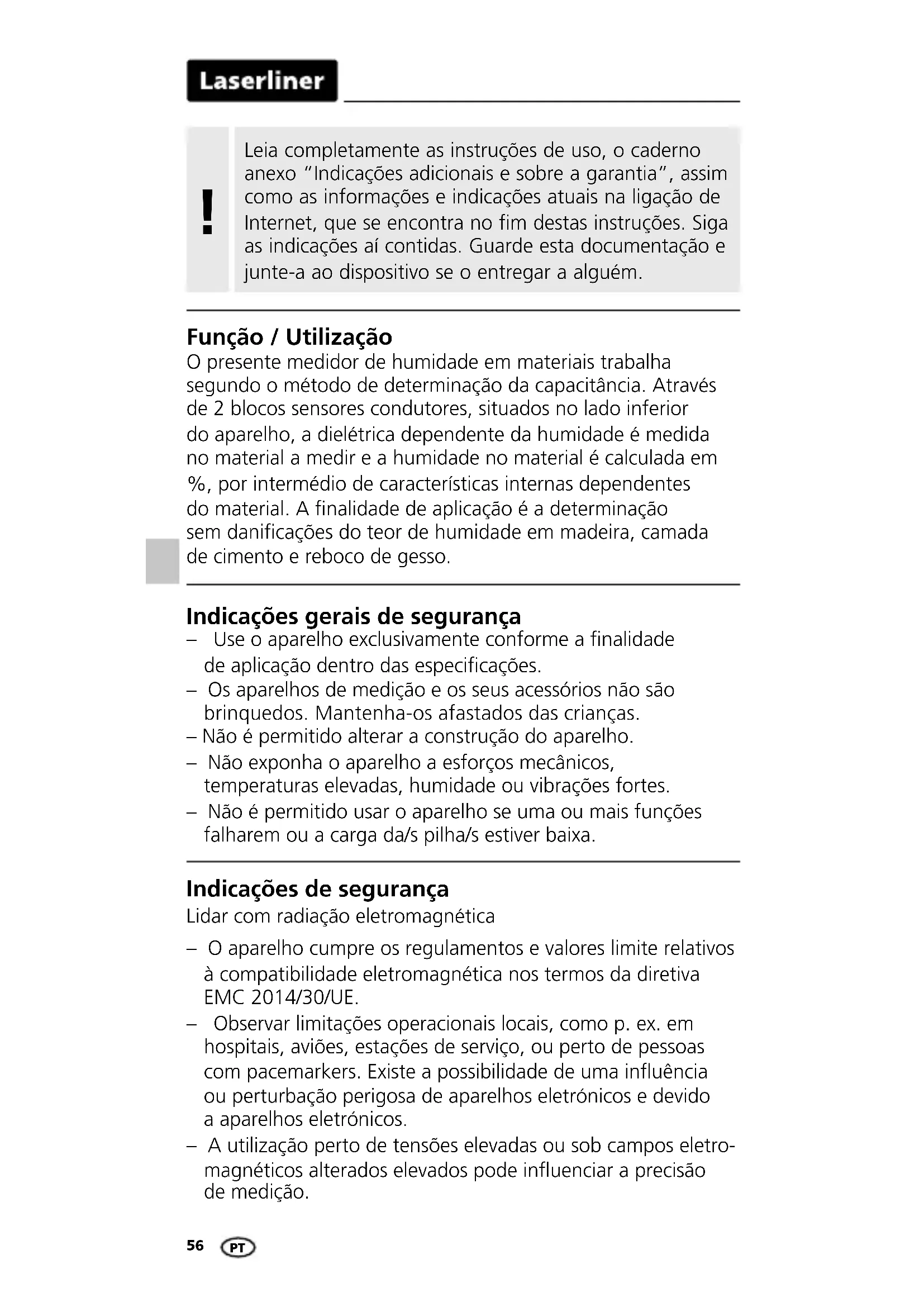 Função / Utilização O presente medidor de humidade em materiais trabalha segundo o método de determinação da capacitância. Através de 2 blocos sensores condutores, situados no lado inferior do aparelho, a dielétrica dependente da humidade é medida no material a medir e a humidade no material é calculada em %, por intermédio de características internas dependentes do material. A nalidade de aplicação é a determinação sem danicações do teor de humidade em madeira, camada de cimento e reboco de gesso. Indicações gerais de segurança – Use o aparelho exclusivamente conforme a nalidade de aplicação dentro das especicações. – Os aparelhos de medição e os seus acessórios não são brinquedos. Mantenha-os afastados das crianças. – Não é permitido alterar a construção do aparelho. – Não exponha o aparelho a esforços mecânicos, temperaturas elevadas, humidade ou vibrações fortes. – Não é permitido usar o aparelho se uma ou mais funções falharem ou a carga da/s pilha/s estiver baixa. Indicações de segurança Lidar com radiação eletromagnética – O aparelho cumpre os regulamentos e valores limite relativos à compatibilidade eletromagnética nos termos da diretiva EMC 2014/30/UE. – Observar limitações operacionais locais, como p. ex. em hospitais, aviões, estações de serviço, ou perto de pessoas com pacemarkers. Existe a possibilidade de uma inuência ou perturbação perigosa de aparelhos eletrónicos e devido a aparelhos eletrónicos. – A utilização perto de tensões elevadas ou sob campos eletro- magnéticos alterados elevados pode inuenciar a precisão de medição.MoistureFinder Compact