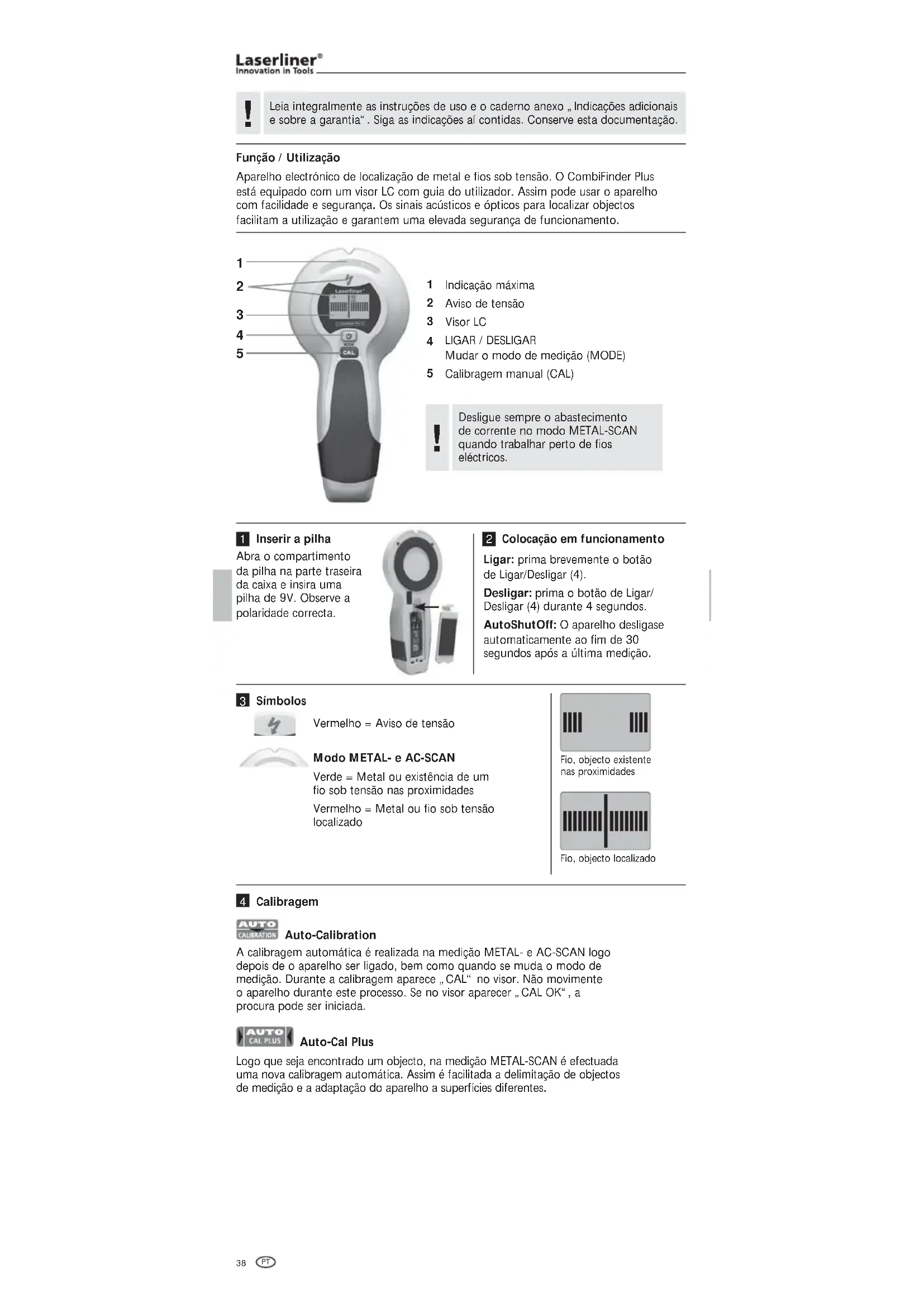 Aparelho electrónico de localização de metal e fios sob tensão. O CombiFinder Plus está equipado com um visor LC com guia do utilizador. Assim pode usar o aparelho com facilidade e segurança. Os sinais acústicos e ópticos para localizar objectos facilitam a utilização e garantem uma elevada segurança de funcionamento. Indicação máxima Aviso de tensão Visor LC LIGAR / DESLIGAR Mudar o modo de medição (MODE) Calibragem manual (CAL) Abra o compartimento da pilha na parte traseira da caixa e insira uma pilha de 9V. Observe a polaridade correcta. Inserir a pilha Ligar: prima brevemente o botão de Ligar/Desligar (4). Desligar: prima o botão de Ligar/ Desligar (4) durante 4 segundos. AutoShutOff: O aparelho desligase automaticamente ao fim de 30 segundos após a última medição. Colocação em funcionamento Auto-Calibration A calibragem automática é realizada na medição METAL- e AC-SCAN logo depois de o aparelho ser ligado, bem como quando se muda o modo de medição. Durante a calibragem aparece „CAL“ no visor. Não movimente o aparelho durante este processo. Se no visor aparecer „CAL OK“, a procura pode ser iniciada. Auto-Cal Plus Logo que seja encontrado um objecto, na medição METAL-SCAN é efectuada uma nova calibragem automática. Assim é facilitada a delimitação de objectos de medição e a adaptação do aparelho a superfícies diferentes. Calibragem Desligue sempre o abastecimento de corrente no modo METAL-SCAN quando trabalhar perto de fios eléctricos.