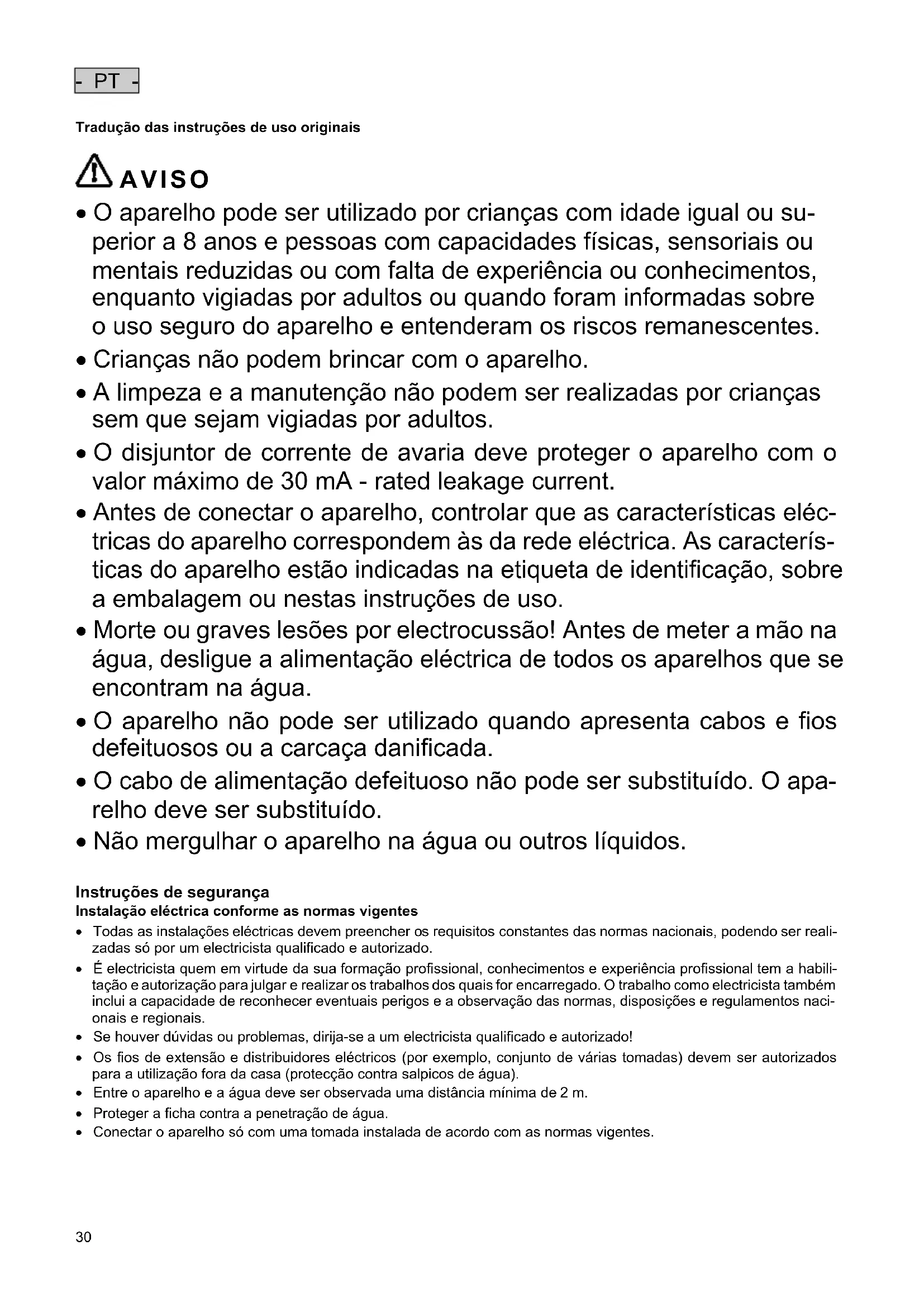 - Não mergulhar o aparelho na água ou outros líquidos. Instruções de segurança Instalação eléctrica conforme as normas vigentes