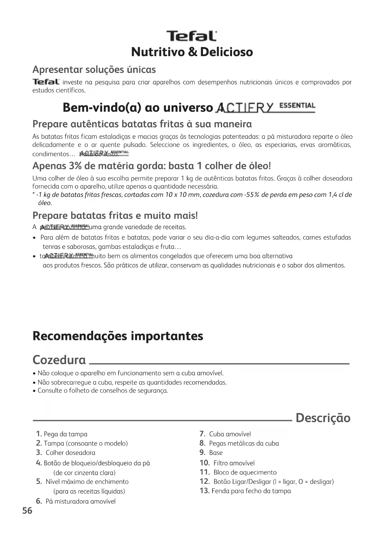 Encontre gratuitamente o manual do aparelho ActiFry Essential FZ3010 TEFAL em formato PDF.