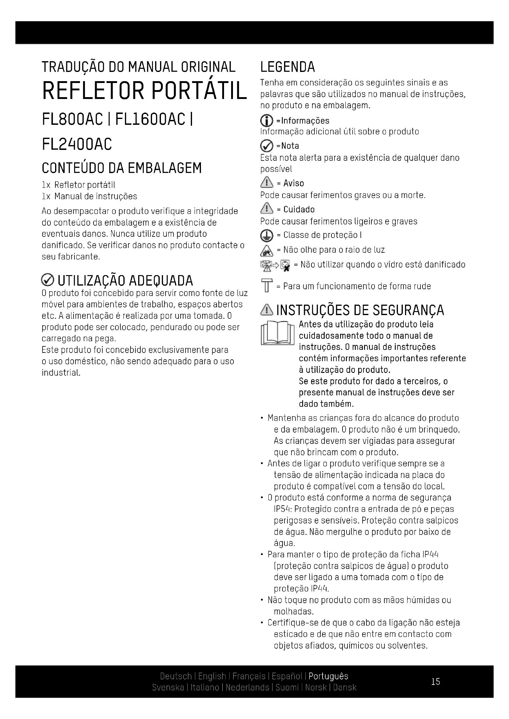 1x Refletor portátil 1x Manual de instruções Ao desempacotar o produto verifique a integridade do conteúdo da embalagem e a existência de eventuais danos. Nunca utilize um produto danificado. Se verificar danos no produto contacte o seu fabricante.