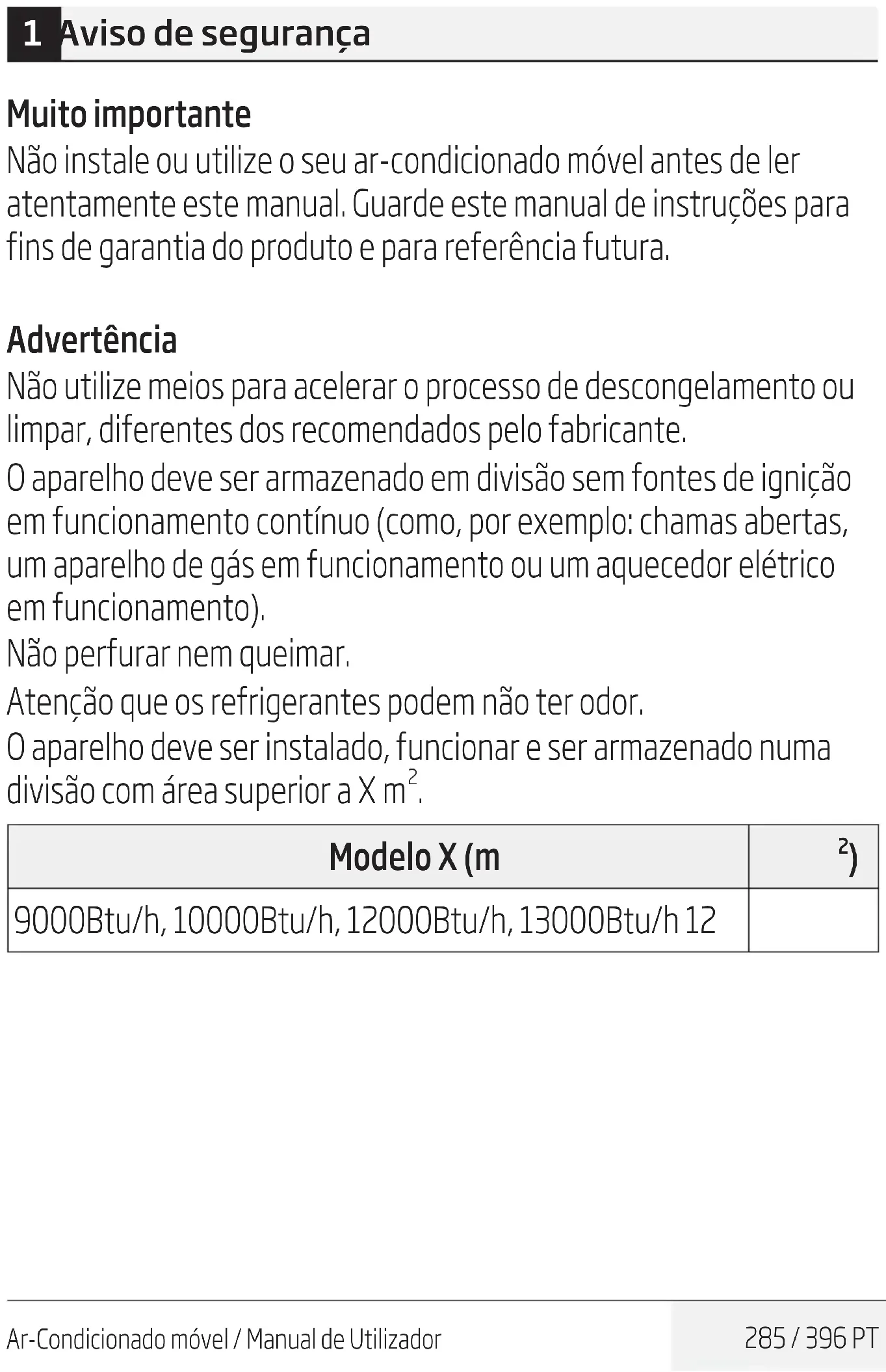 - 9 Manutenção 332 10 Solução de problemas 333 11 Dretrzes europeas relatvas à elmnação de resíduos 334 12 Instruções de nstalação 335 12.1 Instruções para o gás F 13 Especfcações 336Ar-Condicionado móvel / Manual de Utilizador 285 / 396 PT 1 Aviso de segurança Muito importante Não instale ou utilize o seu ar-condicionado móvel antes de ler atentamente este manual. Guarde este manual de instruções para fins de garantia do produto e para referência futura. Advertência Não utilize meios para acelerar o processo de descongelamento ou limpar, diferentes dos recomendados pelo fabricante. O aparelho deve ser armazenado em divisão sem fontes de ignição em funcionamento contínuo (como, por exemplo: chamas abertas, um aparelho de gás em funcionamento ou um aquecedor elétrico em funcionamento). Não perfurar nem queimar. Atenção que os refrigerantes podem não ter odor. O aparelho deve ser instalado, funcionar e ser armazenado numa divisão com área superior a X m p. 335