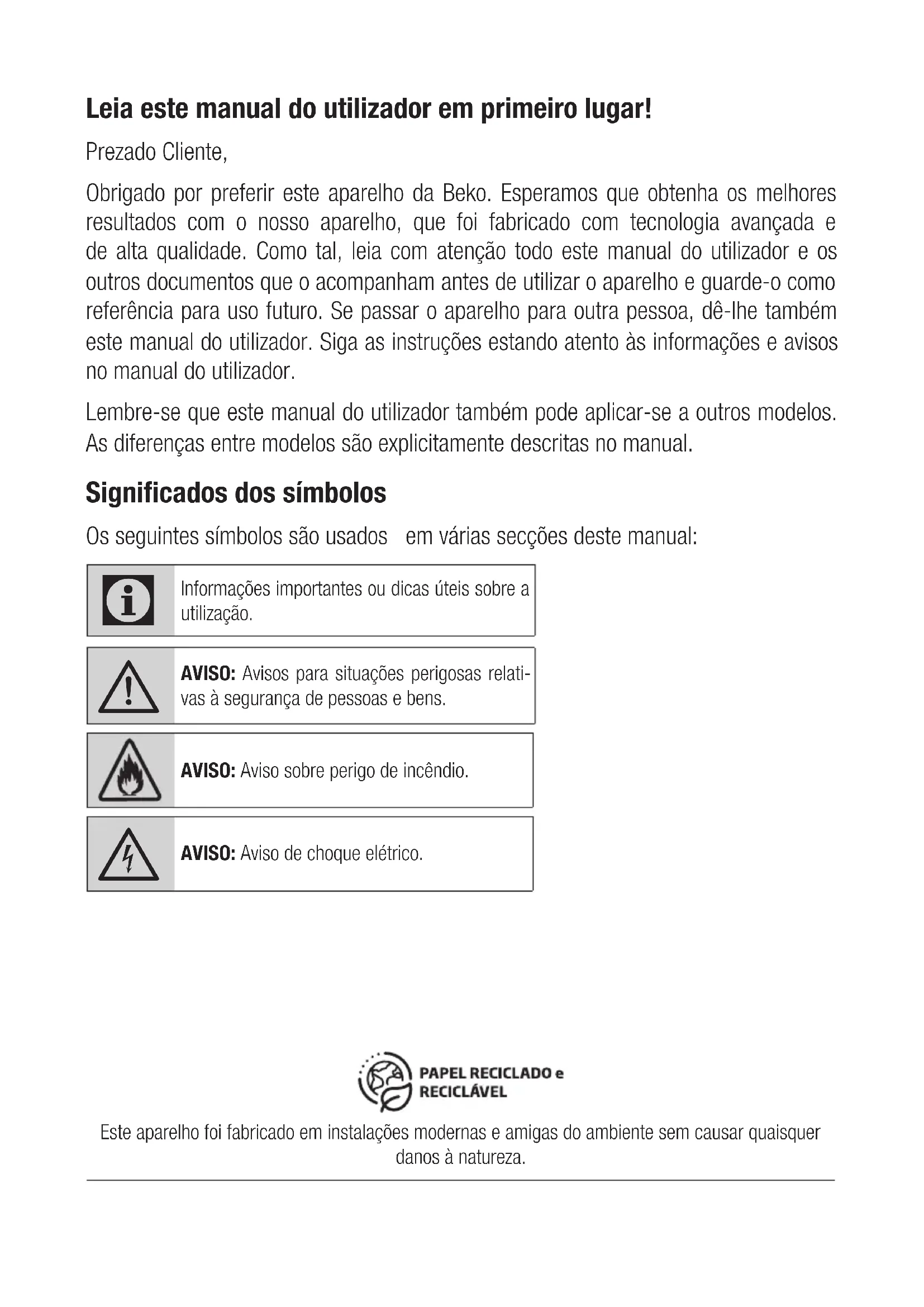 O custo da reparação será pago pelo utilizador nos seguintes casos: Aparelhos utilizados para uso profissional ou não exclusivamente doméstico, em estabelecimentos comerciais, industriais ou públicos. O equipamento desmontado ou adulterado por alguém que não seja expressamente autorizado pelos serviços técnicos. A instalação, transporte, substituição de equipamento, colocação em funcionamento, alteração do sentido das portas. Intervenções de manutenção ou informações sobre a utilização dos aparelhos. Alteração de injetores em aparelhos a gás. As avarias causadas pela falta de manutenção ou limpeza, ou aquelas causadas por um uso inadequado, sobrecarga, abandono ou de forma a não respeitar as instruções de uso ou instalação dos aparelhos. As avarias provocadas por causas acidentais, sinistros de força maior ou resultantes de instalação inadequada e em geral, avarias por razões não relacionadas com o produto. As avarias causadas por ligações que podem apresentar flutuações, irregularidades ou falta de uniformidade no fornecimento, por exemplo: abastecimento de água, impulsionado por pressão, energia solar, energia eólica, geradores de energia elétrica ou outro tipo de fornecimento não-padrão. Os materiais quebrados ou danificados por desgaste ou uso não normal do aparelho, ou consumíveis tais como: juntas, plásticos, borracha, correias, vidros, pincéis, lâmpadas, asas, puxadores, tampas de queimadores, filtros, grades, etc. Os aparelhos que apresentem oxidação, ou danos por corrosão em esmaltes ou tintas, que possam ter sido causados por efeitos químicos ou eletroquímicos da água ou de qualquer outra substância, ou aceleradas por circunstâncias ambientais ou climáticas não propícias. Defeitos estéticos em serigrafia ou pintura. Os danos causados por transporte ou manuseio, colisões, etc. Os aparelhos devem ser instalados de forma acessível em caso de reparação e o utilizador deve assumir os custos necessários para aceder ao aparelho para reparação e substituição. As marcas BEKO, ALTUS, BLOMBERG, y GRUNDIG são distribuídas por Beko Electronics Espanha S.L. DADOS DO APARELHO (a ser preenchido pelo Distribuidor): Detentor: Carimbo do estabelecimento: Modelo: N.º série: Estabelecimento: Data de compra: O fiador e o importador do seu eletrodoméstico é: BEKO ELECTRONICS ESPAÑA S.L. Calle Provenza nº 388 3º Barcelona 08025, Espana. O produto foi fabricado por ARÇELIK A.S (Arçelik A.S.Sütluce Karaagaç Cad. No:2-6 34445 Beyoglu, Istanbul, Turquia) ou o Arctic S.A. (210, 13 Decembrie St., 135200, Gaesti, Dambovita, Romania. Conheça-nos melhor na nossa página: www.beko.com Conserve este documento, é importante para si.BHCB 91632 X