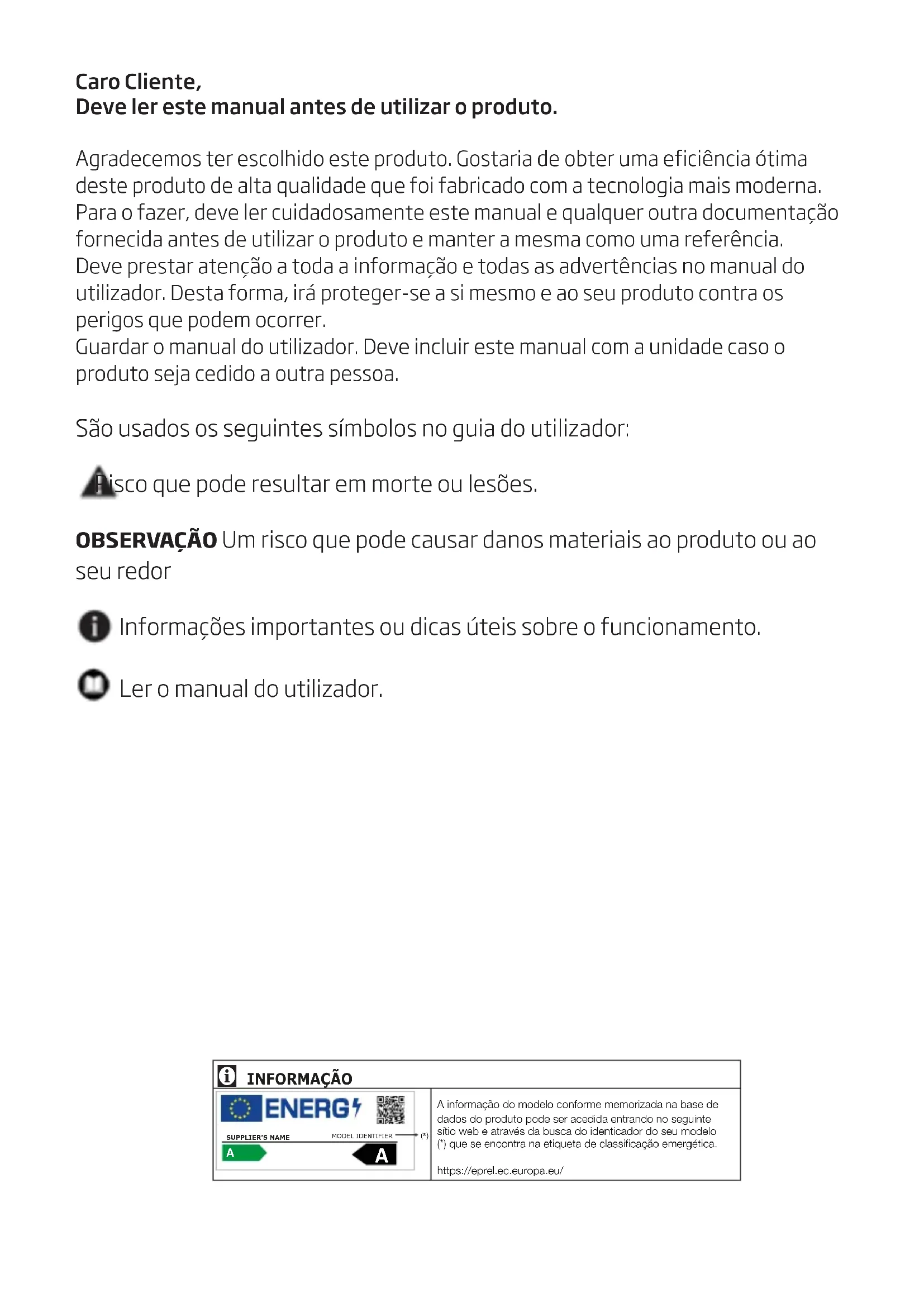 A informação do modelo conforme memorizada na base de dados do produto pode ser acedida entrando no seguinte sítio web e através da busca do identicador do seu modelo (*) que se encontra na etiqueta de classificação emergética.https://eprel.ec.europa.eu/