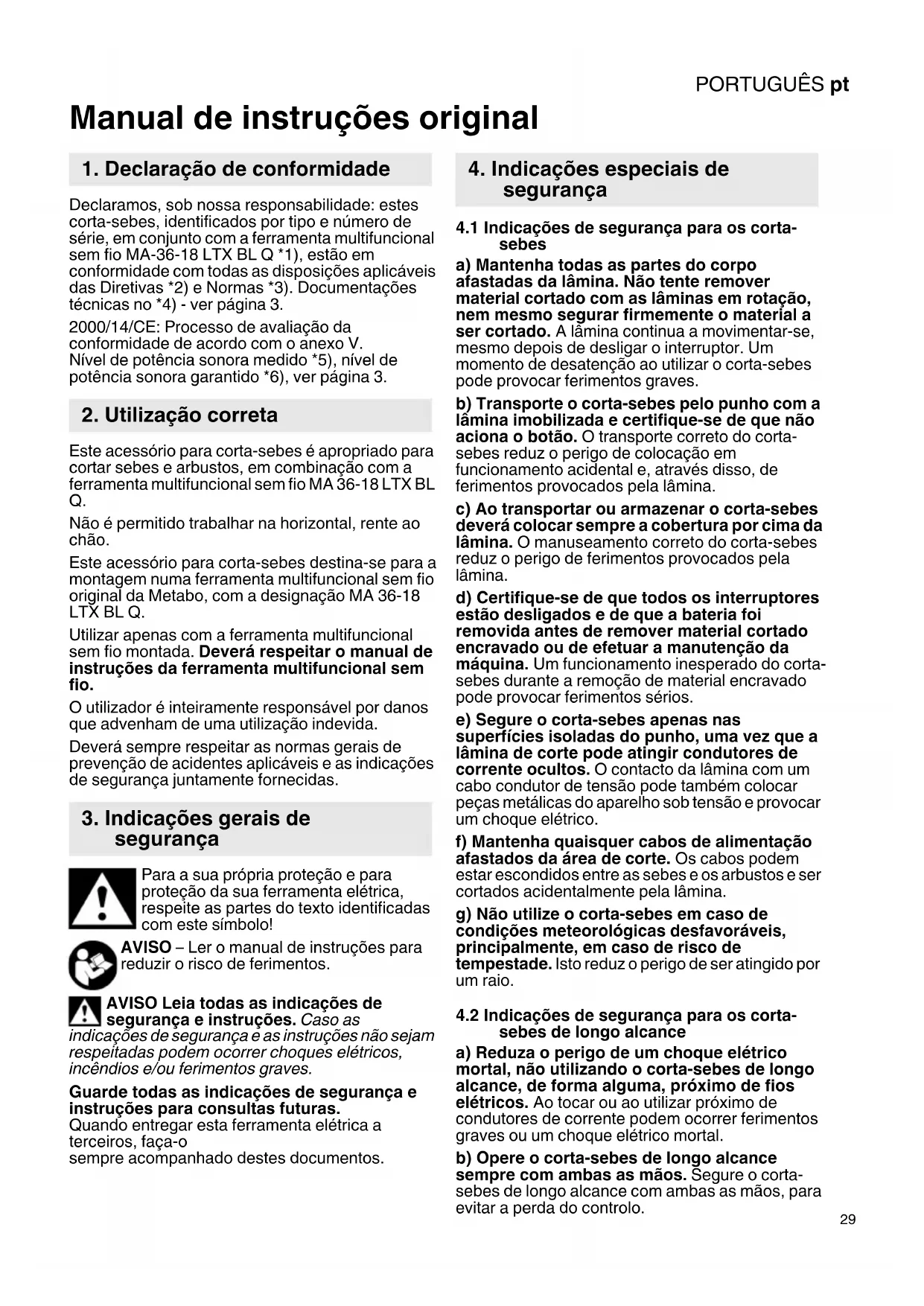 Não é permitido trabalhar na horizontal, rente ao chão. Este acessório para corta-sebes destina-se para a montagem numa ferramenta multifuncional sem fio original da Metabo, com a designação MA 36-18 LTX BL Q. Utilizar apenas com a ferramenta multifuncional sem fio montada. Deverá respeitar o manual de instruções da ferramenta multifuncional sem fio. O utilizador é inteiramente responsável por danos que advenham de uma utilização indevida. Deverá sempre respeitar as normas gerais de prevenção de acidentes aplicáveis e as indicações de segurança juntamente fornecidas. Para a sua própria proteção e para proteção da sua ferramenta elétrica, respeite as partes do texto identificadas com este símbolo! AVISO – Ler o manual de instruções para reduzir o risco de ferimentos. AVISO Leia todas as indicações de segurança e instruções. Caso as indicações de segurança e as instruções não sejam respeitadas podem ocorrer choques elétricos, incêndios e/ou ferimentos graves. Guarde todas as indicações de segurança e instruções para consultas futuras. Quando entregar esta ferramenta elétrica a terceiros, faça-o sempre acompanhado destes documentos.