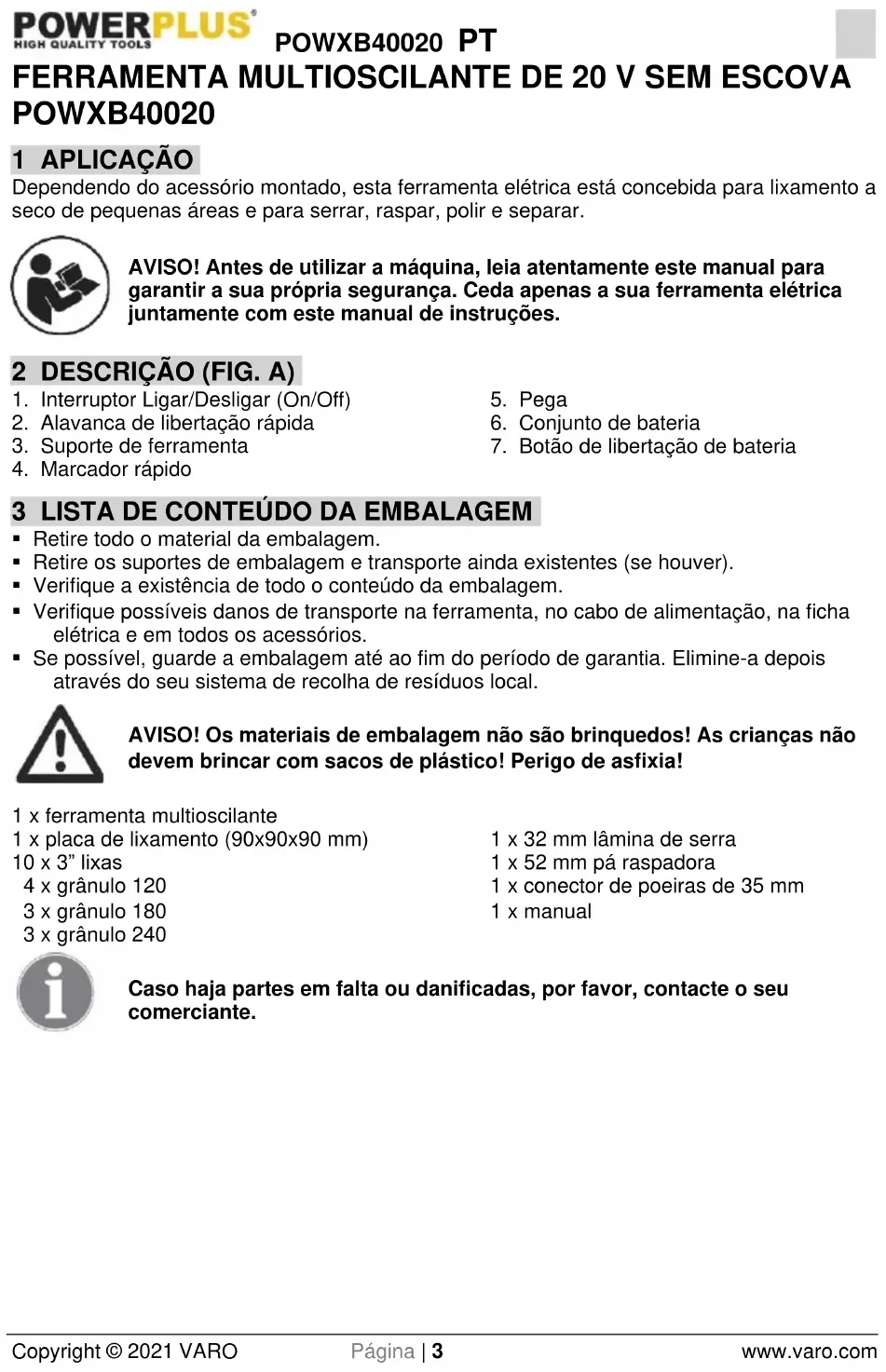 VARO – Vic. Van Rompuy N.V. – Joseph Van Instraat 9 – BE2500 Lier – Bélgica, declara que, Designação do aparelho: Ferramenta multiusos – Operação por meio de bateria Marca: PowerPlus Modelo nº.: POWXB40020 se encontra em conformidade com os requisitos essenciais e outras provisões relevantes das Diretivas Comunitárias aplicáveis, com base na aplicação das normas Europeias harmonizadas. Qualquer alteração não autorizada do equipamento anula esta declaração. Diretivas Europeias (incluindo, se aplicável, as respetivas emendas até à data de assinatura): 2011/65/EU 2014/30/EU 2006/42/EC Normas Europeias harmonizadas (incluindo, se aplicável, as respetivas emendas até à data de assinatura): EN62841-1: 2015 EN62841-2-4 : 2014 EN55014-1 : 2017 EN55014-2 : 2015 Detentor da Documentação Técnica: Philippe Vankerkhove, VARO – Vic. Van Rompuy N.V. O signatário atua em nome da administração da empresa, Philippe Vankerkhove Assuntos Regulamentares – Gestor de Conformidade 21/01/2021, Lier - BelgiumPOWXB40020 NO Copyright © 2021 VARO S i d e | 1 www.varo.com 1 BRUKSOMRÅDE ............................................................................ 3