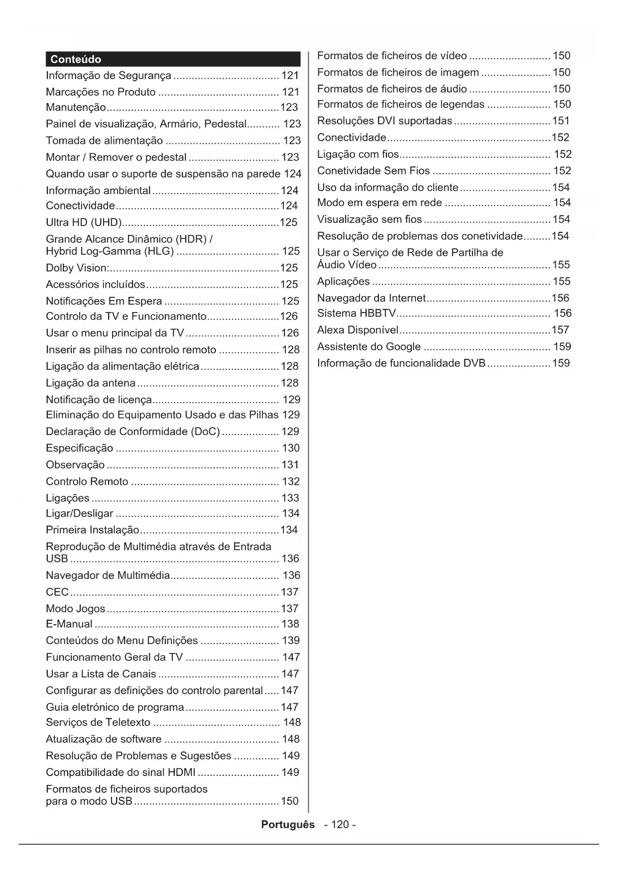 nel_name" on ‘FN’ A TV muda para o canal com o nome especicado channel up on ‘FN’ A TV muda para o canal imediatamente superior, se algum disponível channel down on ‘FN’ A TV muda para o canal imediatamente inferior, se algum disponível FN é a abreviatura para ‘Nome Amigável’. Google é uma marca comercial de Google LLC. Informação de funcionalidade DVB Este receptor DVB é apenas adequado para usar no país para o qual foi destinado a ser usado. Apesar deste receptor DVB estar conforme as últimas especificações DVB no momento da sua produção, não podemos garantir compatibilidade com futuras transmissões DBV devido a alterações que possam ser implementadas nos sinais de difusão e tecnologias. Algumas funções digitais da televisão podem não estar disponíveis em todos os países. Estamos comprometidos em melhorar os nossos produtos; portanto as especificações podem ser alteradas sem aviso prévio. Para aconselhamento sobre onde comprar acessórios, deve contactar o estabelecimento onde adquiriu o seu equipamento.